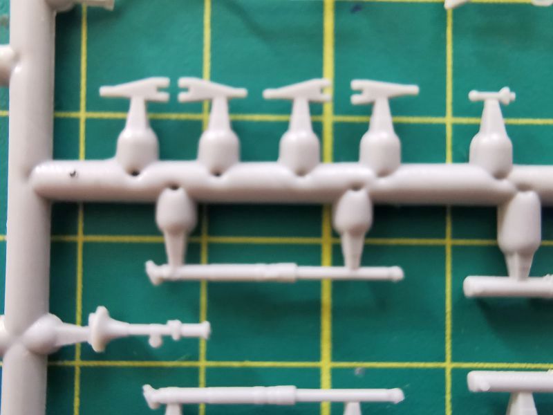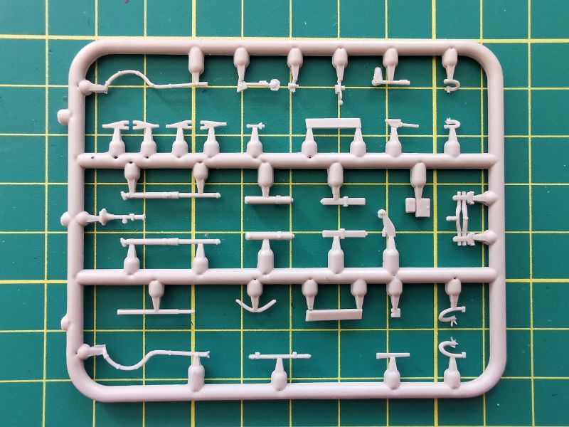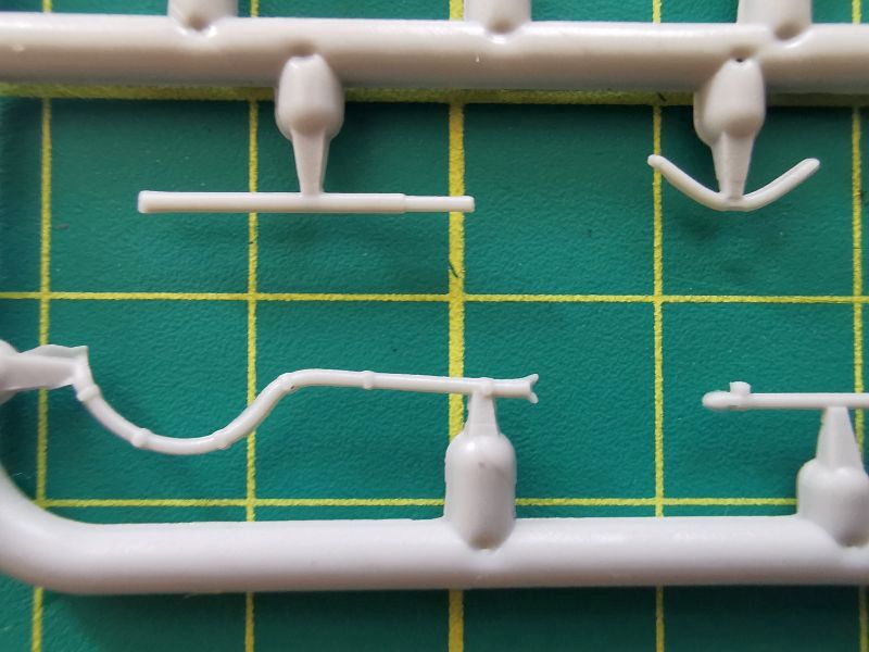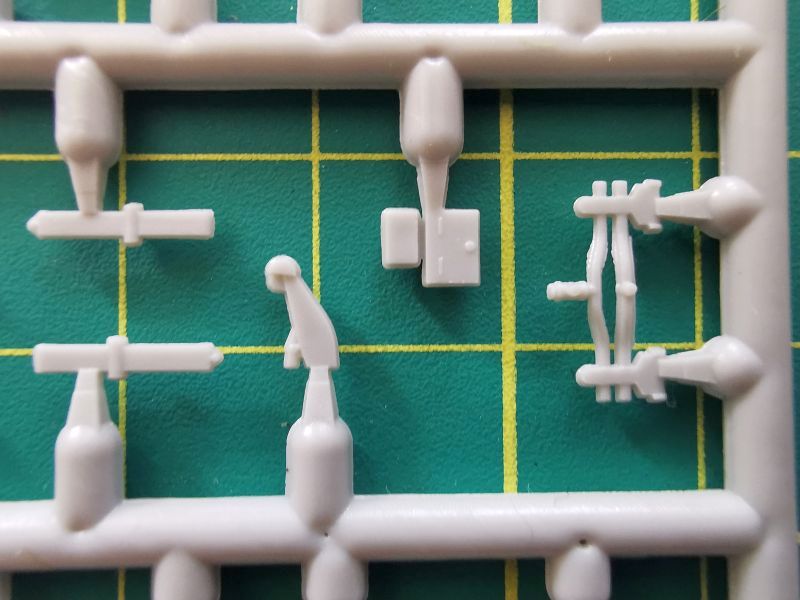 Ostatnia, znacznie mniejsza wymiarowo niż powyżej omówione wypraska jest oznaczona jako „F”. Znajdziemy na niej całą pozostałą drobnicę, czyli siłowniki, dźwignie, drążek sterowy oraz tego typu drobne elementy wyposażenia. Co ciekawe znalazło się tam także trochę imitacji przewodów instalacji elektrycznej i hydraulicznej, którą zamontujemy w lukach podwozia. Coś takiego bardzo rzadko spotyka się w modelach wieloseryjnych, w short runie widzę coś takiego po raz pierwszy.