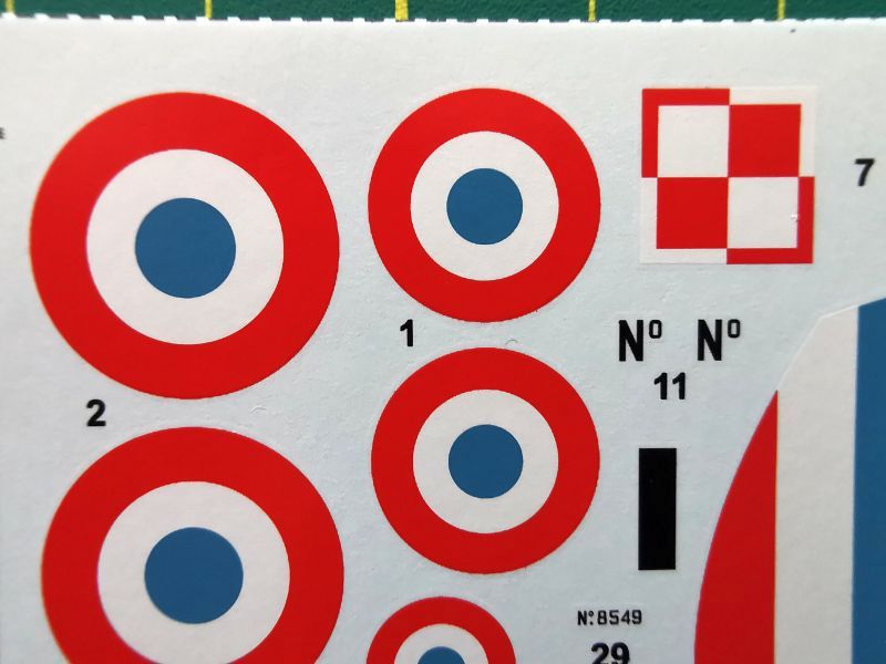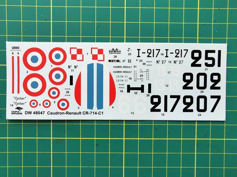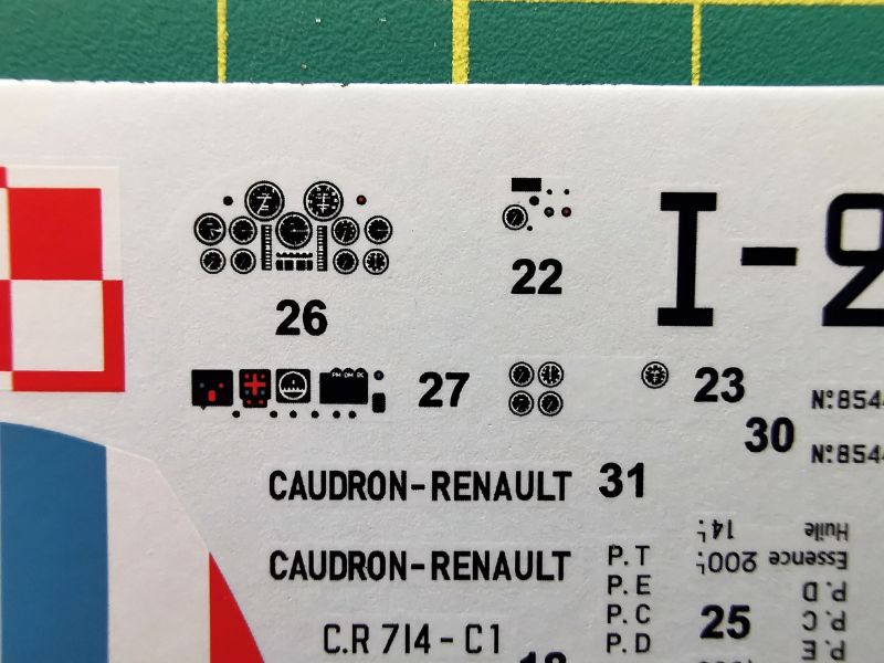 Kalkomania dołączona do zestawu to podłużny arkusik średniej wielkości zawierający komplet oznaczeń dla czterech opcji malowania. Są także napisy eksploatacyjne, które umieścimy głównie na stateczniku pionowym. Jest także sporo tarcz zegarów oraz innych paneli do umieszczenia w kokpicie. To także coraz bardziej powszechna praktyka, w przypadku modeli wieloseryjnych nakładamy je zazwyczaj w formie coraz bardziej szczegółowo wykonanych wtryskowo tablicach przyrządów, w przypadku short runów jest to zazwyczaj element fototrawiony, przy czym kalkomania zastąpiła wcześniej stosowaną kliszę.