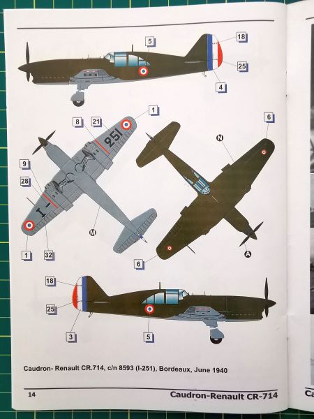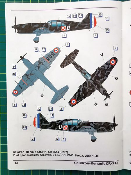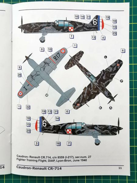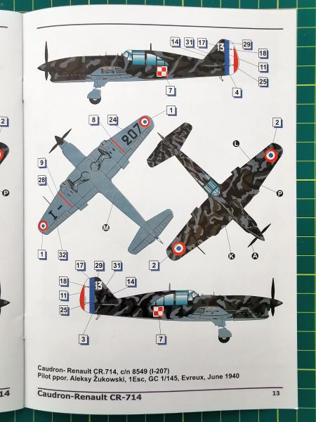 Jak wspomniałem poprzednio do dyspozycji mamy cztery opcje malowania. Trzy pierwsze to samoloty z polskich jednostek walczących we Francji w 1940 r. Pierwsza opcja to samolot c/n 8559 (I-217), nr ser. 27 z DIAP Lyon-Bron, dwie kolejne pochodzą z Groupe de Chasse Polonaise de Varsovie, GC 1/145. Są to samoloty 8544 (I-202) ppor. pil. Bolesława Gładycha oraz 8549 (I-207) ppor. pil Aleksego Żukowskiego. Czwarta propozycja to samolot 8583 (I-251) należący do lotnictwa francuskiego, ale także używany przez lotników polskich. Schematy malowania przedstawiono w formie czytelnych, kolorowych plansz, jednak od razu się rzuca w oczy to, że wszystkie samoloty w malowaniu kamuflażowym, a więc polskie mają jedno i to samo rozmieszczenie poszczególnych plam kamuflażu, a przecież powszechnie wiadomo niemal każdy egzemplarz CR.714 był malowany inaczej. Dwóch pomalowanych identycznie samolotów praktycznie nie było. Ponadto zaproponowany przez producenta schemat jest błędny, co zresztą widać na zamieszczonych w instrukcji zdjęciach archiwalnych i może mieć charakter jedynie poglądowy. Podejrzewam, że producent nie chciał za bardzo straszyć mniej doświadczonych modelarzy trudnymi do wykonania malowaniami. Jeżeli zatem chcemy wykonać jedno z proponowanych przez producenta malowań w sposób poprawny, musimy sięgnąć do literatury. Na szczęście na polskim rynku wydawniczym ukazało się sporo wartościowych pozycji, gdzie takie poprawne schematy można znaleźć, wbrew twierdzeniom zawartym w jednym czasopiśmie modelarskim, że poza cyklem artykułów autorstwa jego redaktora naczelnego nic wartościowego na temat polskiego lotnictwa we Francji nie napisano. O jednej takiej książce napiszę kilka zdań poniżej.