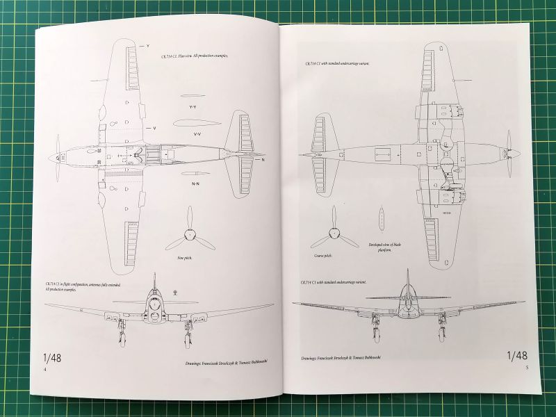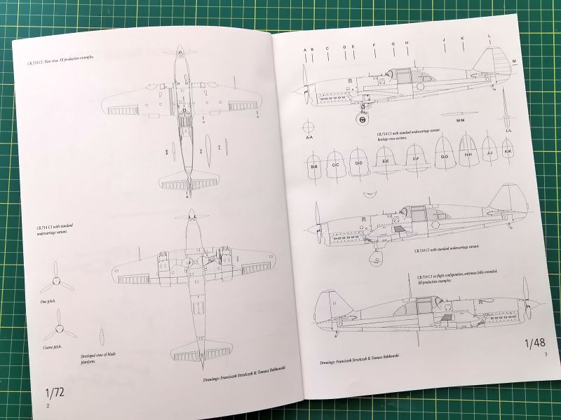 Publikacja zaczyna się od zestawu planów wykreślonych w podziałkach 1/72 i 1 /48. Są to rzuty boczne, góra, dół, przód, tył, przekroje kadłuba i skrzydeł. Śmigła pokazano także na odrębnych rysunkach.