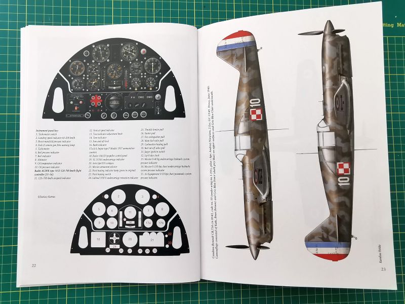 Zdjęcia to jednak nie wszystko, jest trochę przedruków w oryginalnej dokumentacji, w postaci zdjęć silnika i rysunku łoża. Jest to w sam raz dla kogoś, kto będzie chciał wykonać swój model i pokazać jednostkę napędową. Są też zdjęcia karabinów maszynowych oraz celownika, też na pewno się przydadzą. Zdjęcia i plany zostały uzupełnione o grafiki 3D. Są to kabina w kilku rzutach, autorstwa Marka Rysia oraz tablica przyrządów autorstwa Dariusza Karanasa. Każda publikacja z serii Single kończy się planszami barwnymi dla jednego schematu malowania. To także samolot z CG 1/145, nie jest to jeden ze schematów proponowanych w swoim modelu przez Dora Wings, ale samolot 8543 (I-201) kpr. pil. Andrzeja Niewiary. Oczywiście z zupełnie innym schematem plam kamuflażu.