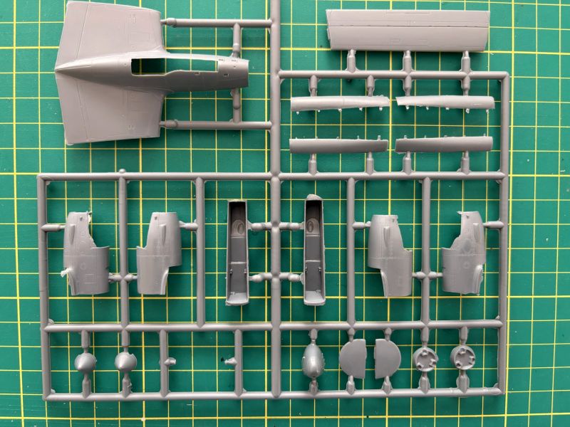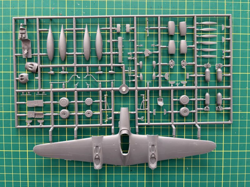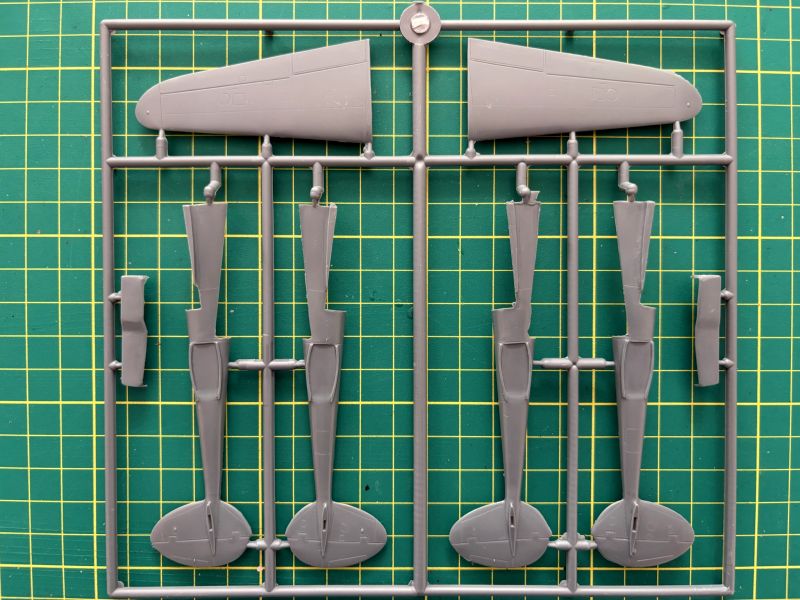 Podstawą zestawu są trzy wypraski z szarego polistyrenu. Zawartość widocznej na zdjęciach to całkiem spora liczba drobnych, lecz wykonanym na niezłym poziomie detali. Znajdziemy tu wszystko, podwozie, kokpit, podwieszenia, wloty powietrza oraz górną cześć kadłuba centralnego wraz z górną częścią skrzydeł. Większość modeli P-38/F-5 ma dość podobny podział technologiczny, więc to że RS Models zastosowało ten sam patent w swoich zestawach specjalnie mnie nie dziwi. Faktura powierzchni jest opracowana w sposób poprawny. Linie podziału wgłębne, wyraźne i równo poprowadzone. Zaznaczono także sporą ilość szczegółów. Wszystkie powierzchnie sterowe stanowią integralne elementy skrzydeł i usterzenia.