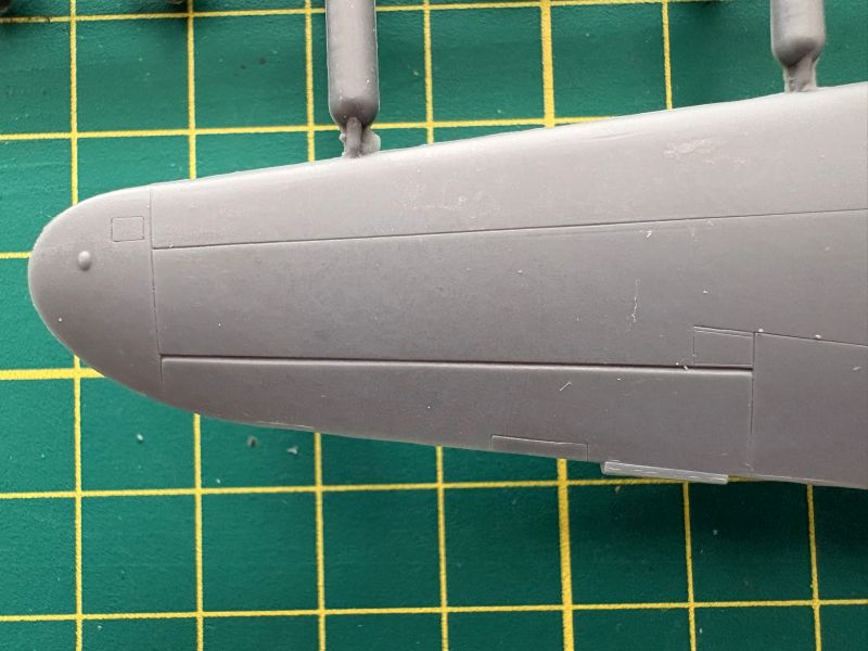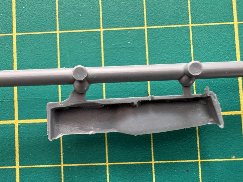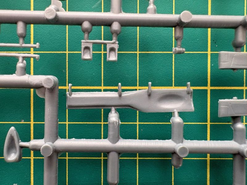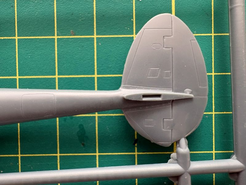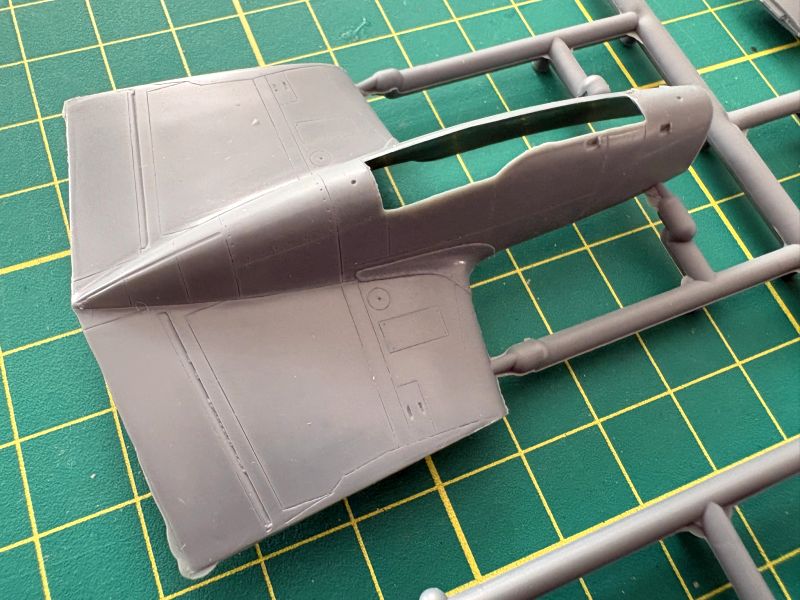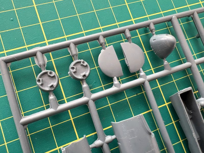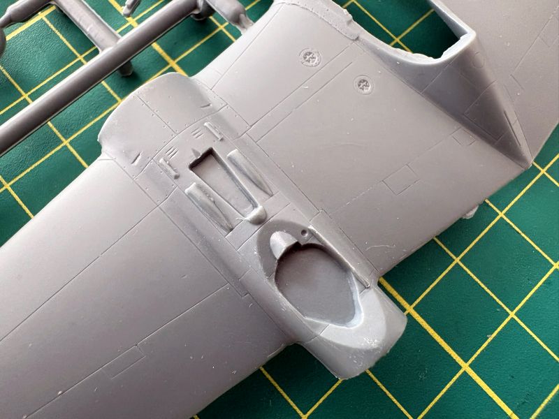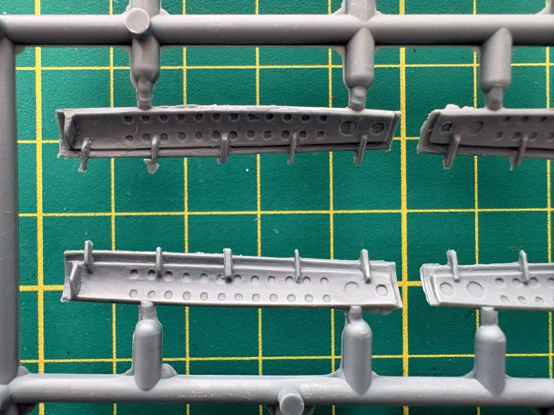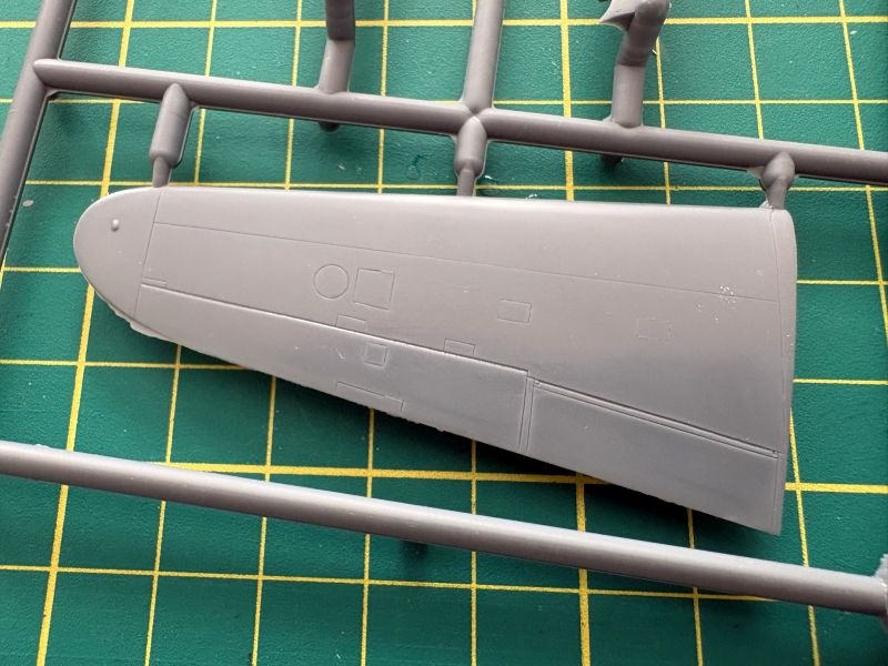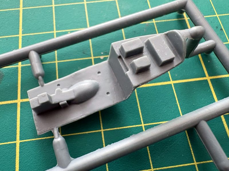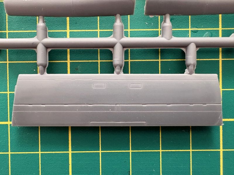 Trzecia wypraska to belki kadłubowe, dolne części skrzydeł oraz luk podwozia przedniego, składający się z dwóch połówek. To rozwiązanie ma sporą zaletę ponieważ łatwiej będzie go detalować, bowiem w środku jest zupełnie pusty. Zresztą takim miejscom jak luki podwozia czy kokpit przyda się dopieszczenie detali, model ewidentnie na tym zyska.