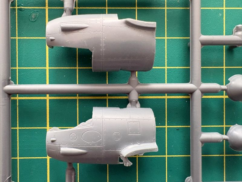Druga wypraska to część nosowa stosowna we wszystkich rozpoznawczych odmianach Lightningów. Składa się z dwóch połówek i żeby ją prawidłowo zamontować na kadłubie centralnym należy trochę z niego obciąć, co na szczęście jest dobrze pokazane w instrukcji. Warto także zadbać o wykonanie imitacje kamer i aparatów fotograficznych, ponieważ przez szyby po bokach i w dolnej części wbrew pozorom sporo widać.