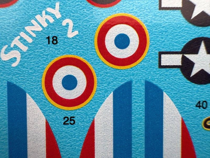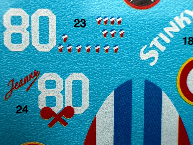 Ponieważ model nie ma na wyposażeniu żadnych dodatków w postaci blaszek, żywic czy wydruków 3D. zajmę się od razu kalkomaniami. To średniej wielkości arkusz, na którym znajdziemy oznaczenia, godła, numery i napisy eksploatacyjne. Dość sporo się zmieściło. Jak to wygląda w zbliżeniu widać na zdjęciach, siłą rzeczy skoncentrowałem się na najbardziej interesującym mnie malowaniu…
