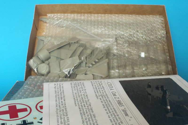 Zestaw zapakowano w niewielkie jak na wymiary modelu, ale solidne kartonowe pudełko, z bardzo efektownym boxartem, przedstawiającym naszego bohatera w walce z brytyjskim lekkim krążownikiem. W środku znajdujemy dwie torebki foliowe zawierające drobne elementy oraz połówki kadłuba, płatów i pływaki oraz płytkę z oszkleniem. Wszystko przełożone sporym arkuszem folii bąbelkowej. Części żywiczne uzupełnione są blaszką fototrawioną oraz dwoma detalami z białego metalu.