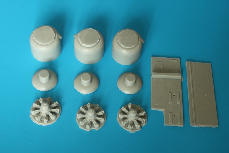 Producent zadbał ponadto o wnętrze kadłuba – w obu jego połówkach odtworzono całą strukturę konstrukcji i to na całej długości. Do tego dochodzi kilkanaście elementów wyposażenia kabin. Podobnie ma się sprawa z silnikami. Trzy gwiazdowe Alfy Romeo stanowiące napęd maszyny wykonano jako pojedyncze odlewy, lecz nie można tu mówić o żadnych uproszczeniach. W modelach żywicznych zdarzają się czasem bąbelki powietrza. W omawianym zestawie, też się zdarzają lecz na szczęście jest ich niewiele, i w łatwych do usunięcia miejscach. Najwięcej znalazło się ich w łopatach śmigieł, ale kawałek pręta z żywicy i polistyrenu oraz klej CA powinien załatwić sprawę.