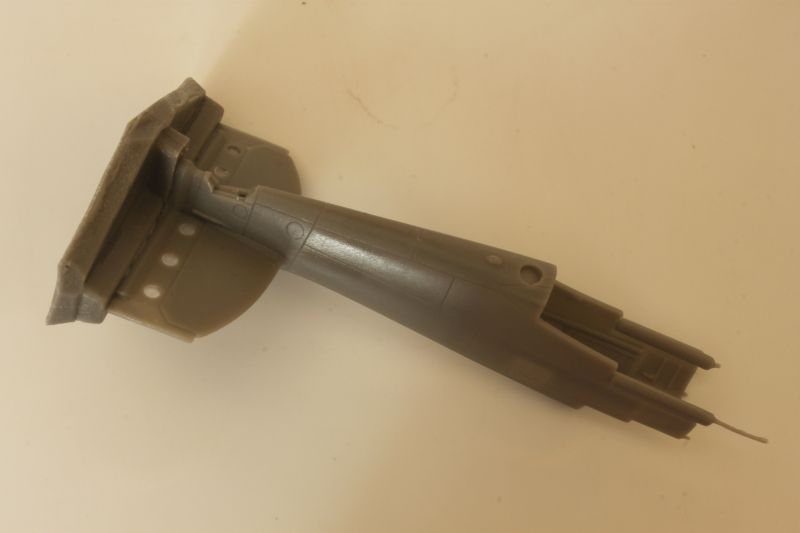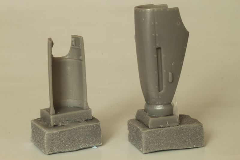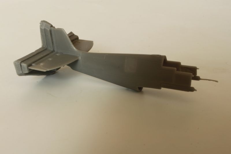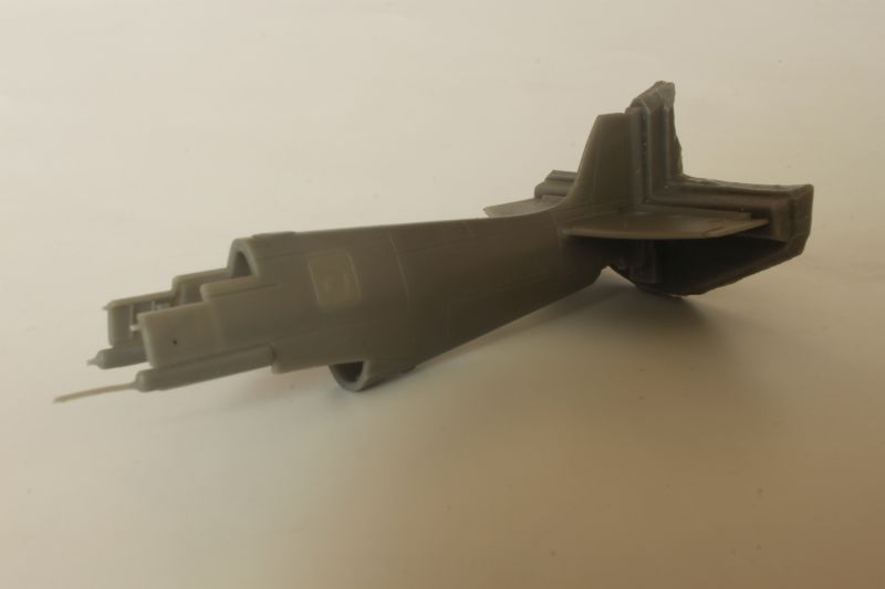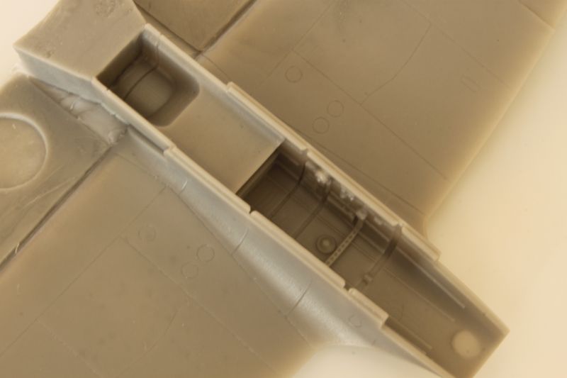 Drugim zasadniczym elementem modelu jest tylna część kadłuba wraz z nieruchomymi elementami usterzenia Dokleić musimy jedynie powierzchnie sterowe, które wykonane są oddzielnie. Martwić musimy się jedynie o poprawne sklejenie kadłuba z płatem. Oczywiście nie trzeba dodawać, że wnętrze ma bardzo wiernie odwzorowaną konstrukcję kadłuba. Możemy również, jeśli mamy ochotę, otworzyć pokrywy przedziału foto, w tym celu należy usunąć pokrywy żywiczne i zastąpić je fototrawionymi.