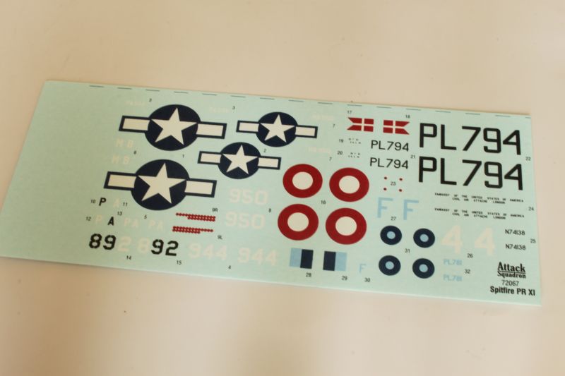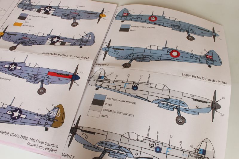 Dołączona do zestawu kalkomania umożliwia wykonanie rozpoznawczego Spita w jednym z sześciu ciekawych pomimo, iż jednokolorowych malowań. Do dyspozycji mamy cztery malowania amerykańskie, jedno brytyjskie i jedno powojenne duńskie. Trzeba przyznać, że wybór nie jest łatwy. Mi najbardziej przypadły do gustu biała 944 znana z filmu dokumentalnego 9więcej na jego temat na blogu firmowym producenta, biała 4 należąca do Ambasady USA w Londynie oraz maszyna Królewskiego Lotnictwa Danii. Kalkomania wydrukowana jest poprawnie, na cienkiej błonie, tylko na dwóch elementach występują delikatne przesunięcia, ale są to pasy na usterzeniu, więc łatwo poprawić. Instrukcję opracowano w języku angielskim, schematy są czytelne, pominięto jedynie kwestię otwarcia luków w przedziale foto, ale cóż łatwo się połapać jak to wykonać oglądając części. Muszę natomiast zwrócić uwagę na czerwone pasy na osłonie silnika w dwóch malowania USAF – producent wskazuje, że powinny być pomalowane kolorem Insygnia Yellow. Nie wiem czy to błąd czy tak miało być – tu trzeba zajrzeć do dokumentacji. Moim zdaniem powinny być czerwone.