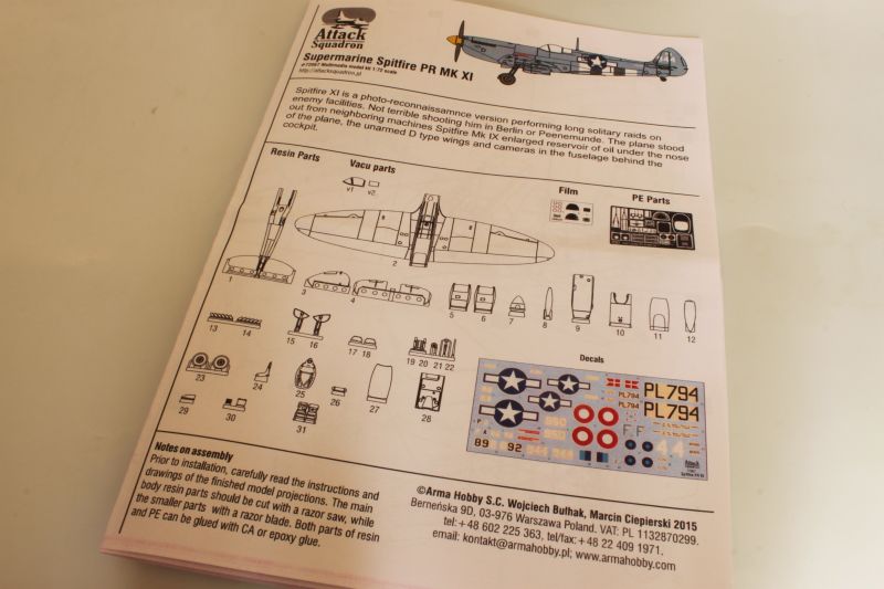 Model Spitfira Pr Mk XI jest sprzedawany pod marka Attack Squadron. Do wyboru mamy dwie wersje Pro i Easy. Wersja Pro zawiera dodatkowe elementy oraz kalkomanie do sześciu malowań. Model wykonano w technologii wydruku 3D, w oparciu o wydruki wykonano żywiczne odlewy. Model zapakowano w niewielkie kartonowe pudełko utrzymane w typowej dla tej marki bardzo estetycznej szacie graficznej. Części zabezpieczono przed uszkodzeniem folią bąbelkową.