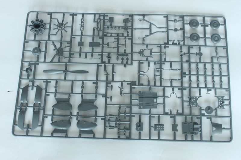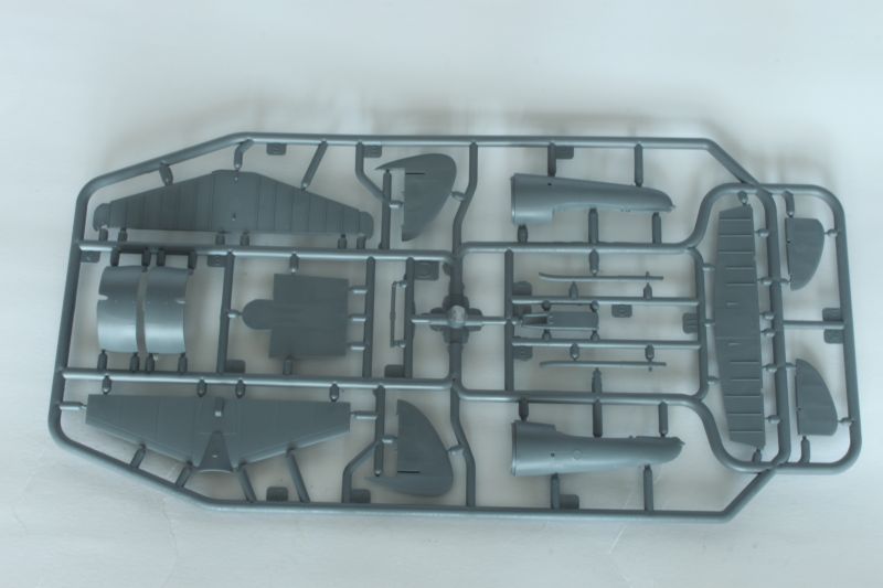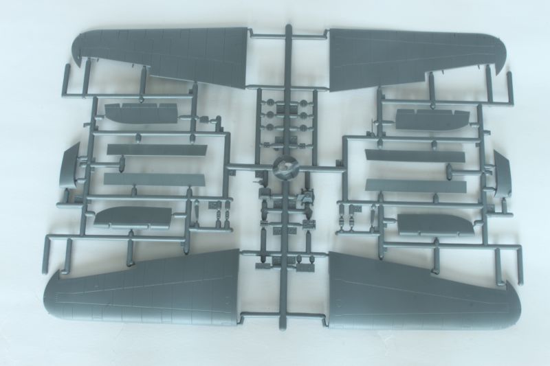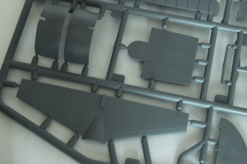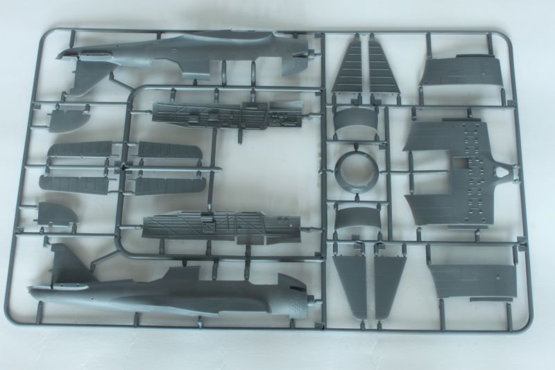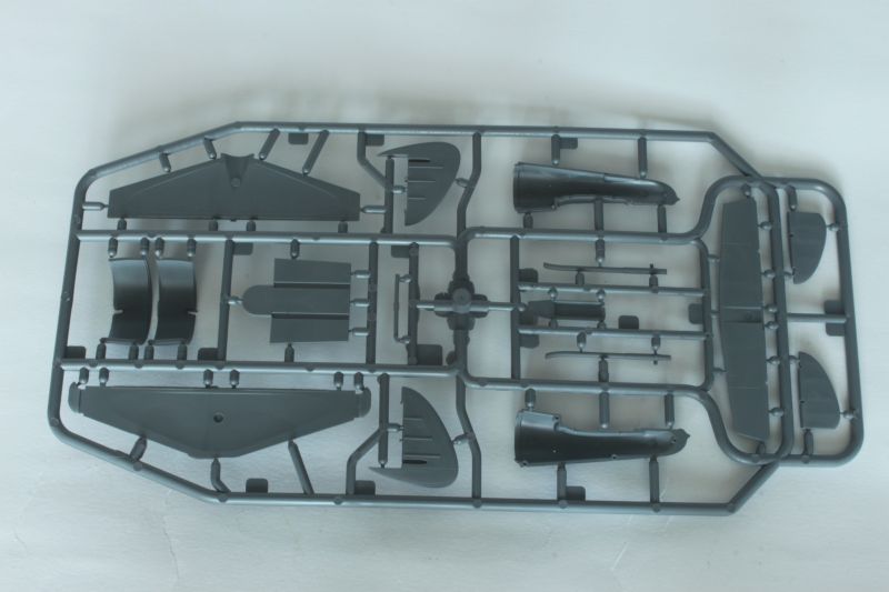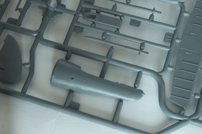 Wszystkie elementy charakterystyczne dla P-42 zostały zgrupowane na jednej osobnej ramce. Znajdziemy tam zatem chowana w kadłub kołyskę bombardiera, nową osłonę silnika, rury wydechowe i oczywiście podwójne usterzenie. to ostatnie montujemy do kadłuba po odcięciu piłką jego tylnej części. Nowy tył kadłuba posiada odpowiednią kryzę umożliwiającą połączenie go z częścią przednią, zaś linia ciecia przebiega wzdłuż linii podziału blach. Jeżeli zatem całą operację przeprowadzimy dokładnie i ostrożnie może obyć się bez szpachlowania.