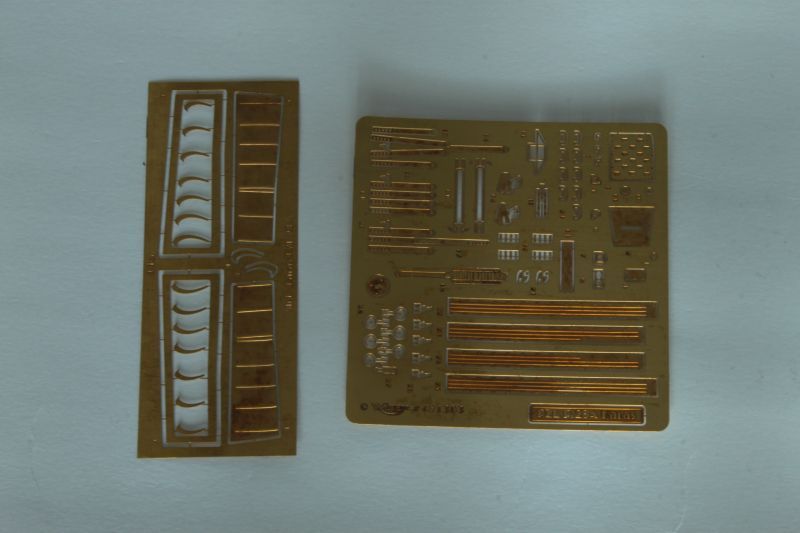 Uzupełnieniem części wtryskowych jest fototrawiona blaszka, a właściwie dwie blaszki. Jedna z nich zawiera szereg drobnych detali, takich jak pasy, celowniki czy dźwignie, na drugiej zaś znajdują się charakterystyczne dla PZL P-23A sloty. Oczywiście są to blaszki z modelu tego właśnie samolotu. Niewielki arkusik kalkomanii, jaki dołączono do modelu zawiera szachownice, numery oraz wszystkie tarcze zegarów umieszczonych na tablicy przyrządów i w kilku innych miejscach.