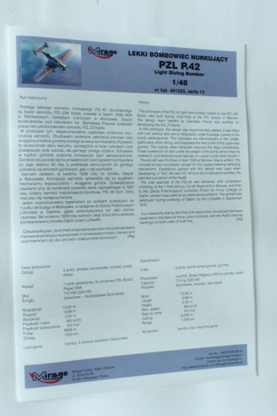 Seria modeli samolotów liniowych wywodzących się z PZL P-23 Karaś stała się jednym ze znaków firmowych Mirage Hobby. Po wypuszczeniu całej serii Karasi w wersjach A i B w różnych konfiguracjach i wariantach malowania, przyszła pora na P-43 "Czajka", natomiast cykl zamyka zestaw umożliwiający budowę modelu prototypu bombowca nurkującego PZL P-42. Najbardziej charakterystyczna cecha wyróżniająca go od innych odmian Karasia to oczywiście podwójne usterzenie. Doświadczenia zebrane podczas testów z PZL P-42 wykorzystano przy projektowaniu następcy Karasia - PZL-46 Sum.