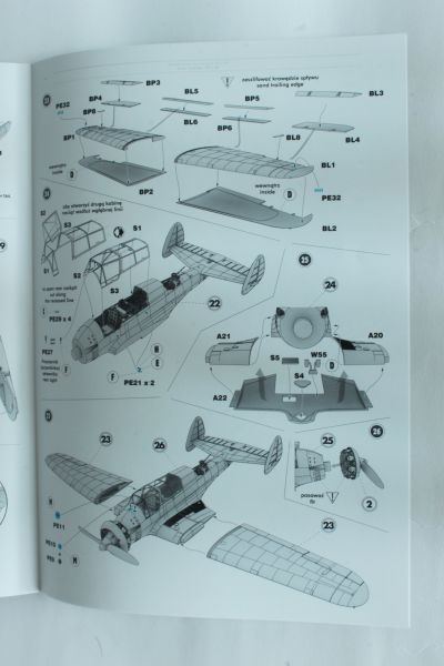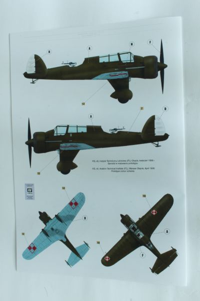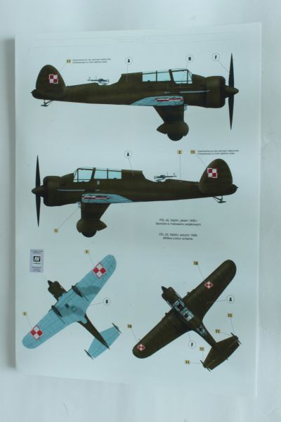 Instrukcja montażu i malowania ma postać broszury wydrukowanej w całości na kredowym papierze. Znajdujemy w niej historie samolotu, którego model będziemy budować, a także sporo przydatnych podczas klejenia uwag i informacji. Schematy montażu opracowano w formie grafiki komputerowej, są one czytelne, jednak przed rozpoczęciem budowy warto poświęcić im nieco więcej uwagi. Znalazłem co prawda kilka literówek w oznaczeniach kolorów, ale nie mają one większego wpływu na całość zestawu, więc nie będę urządzać z tego powodu histerii i wysyłać w kosmos właścicieli firmy. Każdy myślący człowiek sprawdzi w dokumentacji jak coś się nie zgadza bez konieczności robienia rabanu na pół internetu. Schematy malowania do dyspozycji mamy dwa. Pierwszy z nich z okresu kiedy samolot przechodził testy na Okęciu i miał białe powierzchnie sterowe stateczników pionowych, zaś drugie ukazuje naszego bohatera w wojennym malowaniu z szachownicami po obu stronach sterów kierunku. Obydwa proste w formie i przez to ciekawe. Schematy są oczywiście kolorowe i czytelne, zaś kolorystykę podano według palety Vallejo Model Air.