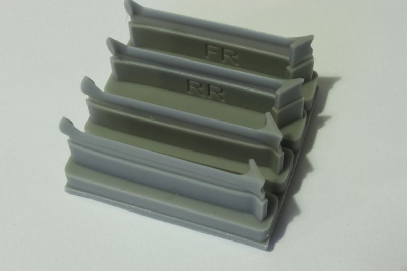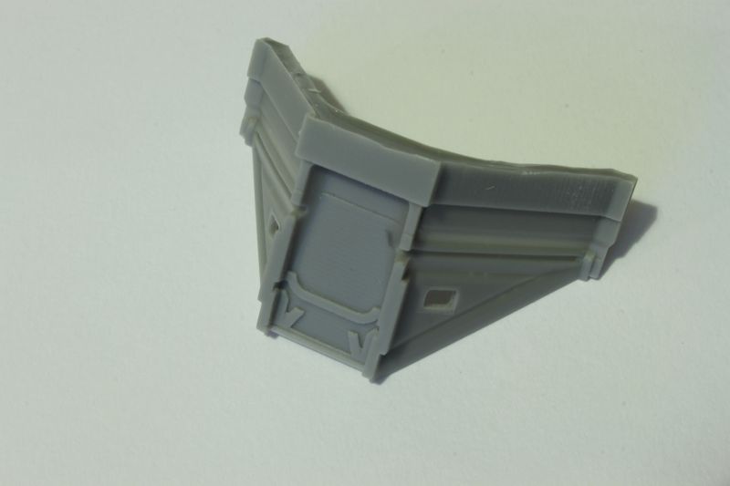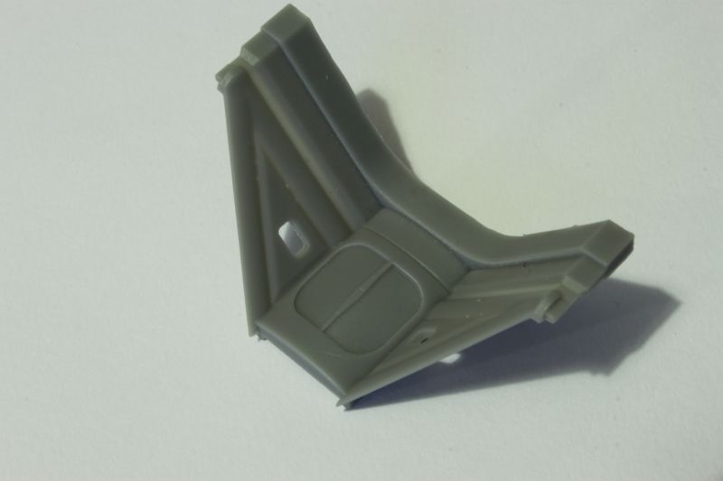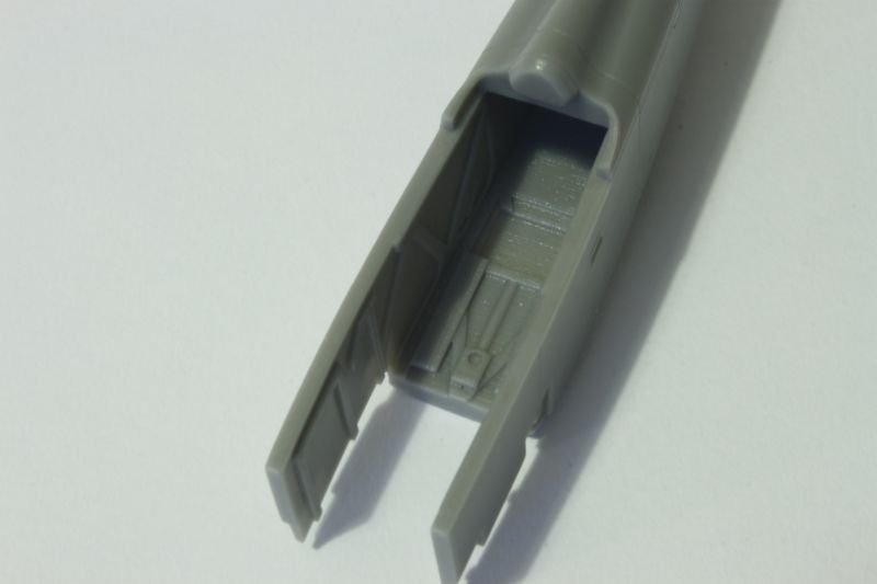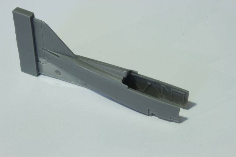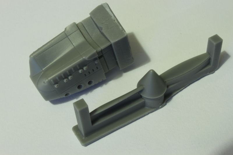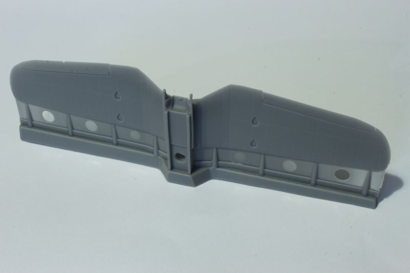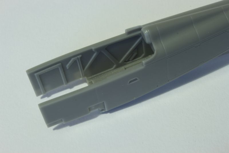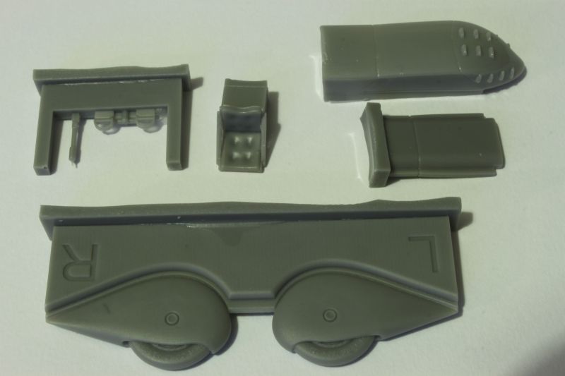 Przednia część kadłuba składa się z dwóch zasadniczych elementów. Zastosowano tu dokładnie taki sam patent, jak w ostatnich modelach w skali 1/72, czyli dolna część wraz z goleniami podwozia, które należy wzmocnić drutem i zaszpachlować oraz przednia część - czyli osłona silnika. Jest to dobre rozwiązanie, gdyż ogranicza do minimum ryzyko zwichrowania bryły budowanej przez nas miniatury. Podczas montażu należy uważać jedynie na zachowanie linii symetrii modelu. Na słowa uznania zasługuje dokładność i precyzja z jaką zaprojektowano oba elementy - wszelkiego rodzaju detale takie jak rury wydechowe, wloty powietrza, wzierniki. Najwyższa jakość. Zastrzały wykonano jako pojedynczy odlew, ale każdy z nich ma oznaczenie np. FR - prawy przedni. Przy montażu należy bezwzględnie pamiętać który jest który, bo potem mogą pojawić się problemy przy montażu. Pamiętać należy, że sposób odlania zastrzałów uniemożliwia pomalowanie ich przed wycięciem. Miejsca zamocowania ich do kadłuba mają kwadratowy przekrój i dość dużą powierzchnię, można tam nanieść oznaczenia np. markerem. Koła odlano razem z osłonami, ale zrobiono je tak dokładnie, że z pomalowaniem ich nie będzie żadnego problemu. Opony mają czytelne napisy na bokach. Pozostałe detale żywiczne usterzenie (poziome bez wychylonych powierzchni sterowych), wanna chłodnicy oraz wyposażenie kokpitu.