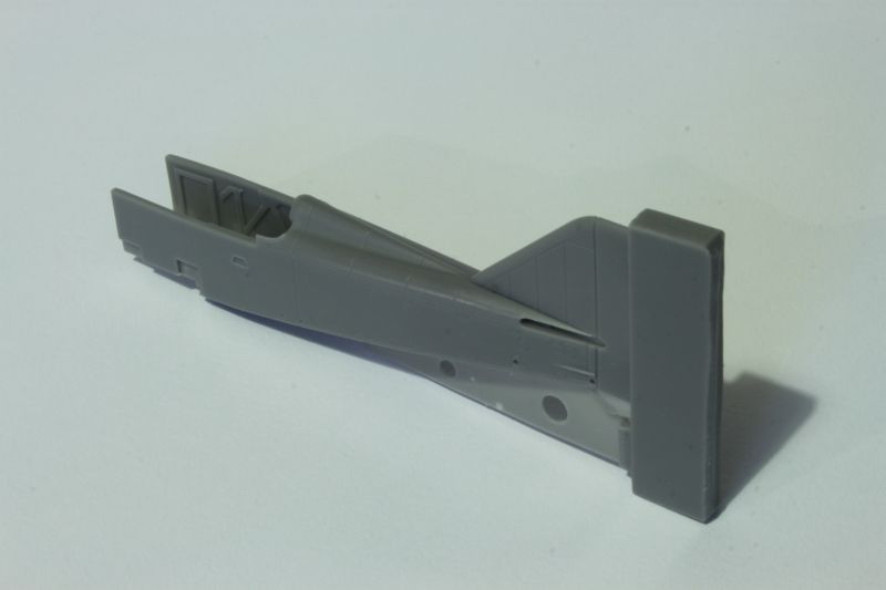 Model nie ma tradycyjne go podziału kadłuba, jak w przypadku P.6 i P.7, ale modułowa jak w przypadku P.1 i wszystkich "Pławszczków" w skali 1/72. Mamy zatem tylną część kadłuba odlaną jako jeden element ze sterem kierunku oraz kokpitem. Pięknie odtworzono fakturę powierzchni zarówno zewnętrznych, linie podziału są wyraźne, równe i delikatne. Ponadto w kokpicie widoczna jest cała konstrukcja kadłuba, czyli rama, podłoga czy zagłówek. Wszytko to będzie doskonale widoczne przez otwarty kokpit. Listwy pozycjonujące kadłub z innymi elementami to w Arma Hobby standard.
