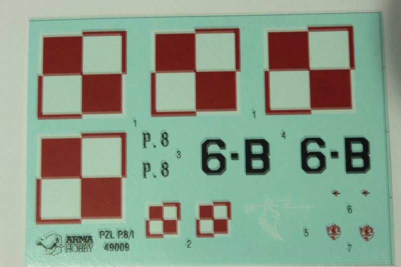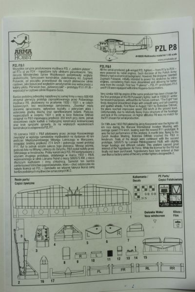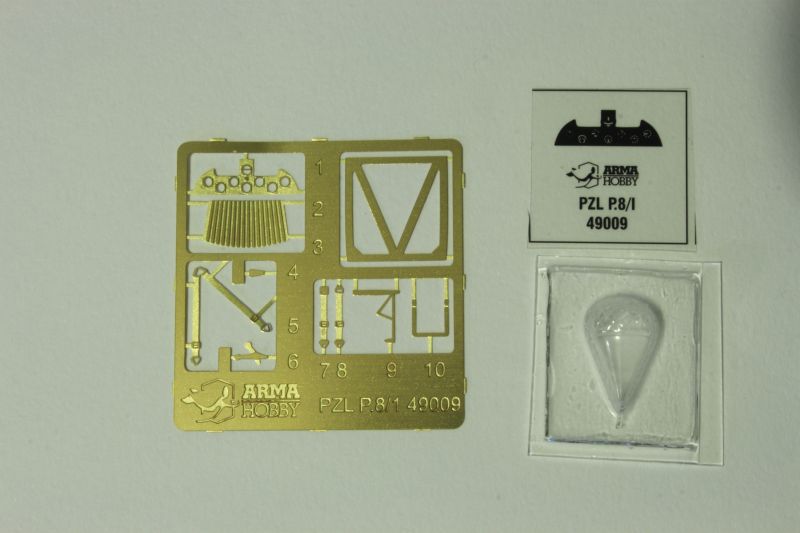 Elementy żywiczne tradycyjnie już Arma Hobby uzupełniła o multimedia w postaci blaszki fototrawionej, na której znajdują się tablica przyrządów, pasy, elementy chłodnicy oraz kilka innych jakże pożytecznych drobiazgów. Do tego dysponujemy kliszą z zegarami a także wykonanym metodą vacu wiatrochronem. Kalkomania to niewielki arkusik, ale mamy tam wszystko co powinien mieć efektowny model polskiego samolotu - poza wielkimi szachownicami jest również piękne godło, trochę numerów i logotypów, czyli wszystko co miał na sobie pierwszy prototyp P.8. Nie znalazłem na niej żadnych błędów merytorycznych ani drukarskich.