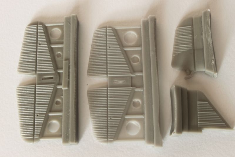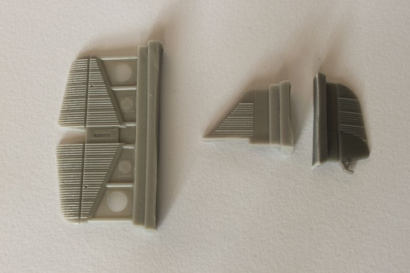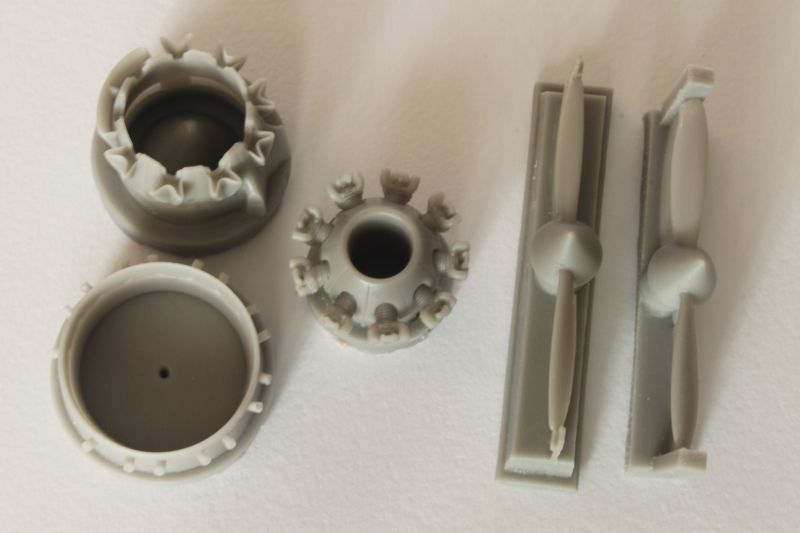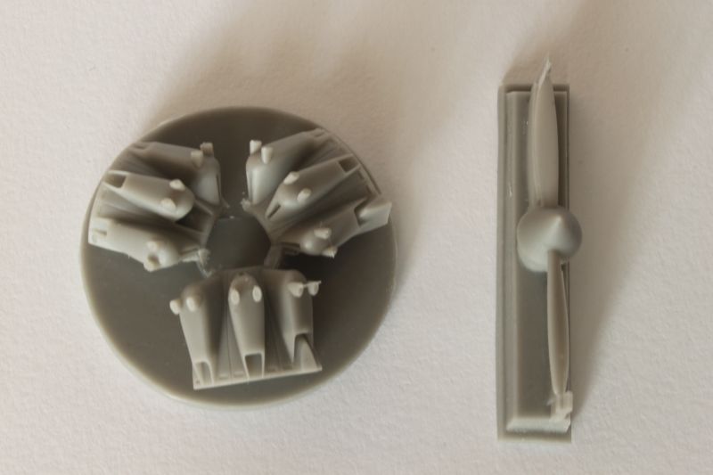 Różnice pomiędzy oboma zastawami dotyczą usterzenia oraz części dziobowej kadłubów. W przypadku PZL P.7 dysponujemy jednym rodzajem usterzenia poziomego oraz jednym rodzajem śmigła. Jeżeli chodzi P.6 (zdjęcia po prawej) śmigła i usterzenia poziome są dwa do wyboru, co umożliwia budowę obu prototypów czyli P.6/I i P.6/II. Silniki to również istotna różnica, pomimo, że obydwa producent podzielił na trzy elementy. Podział zastosowany w przypadku P.6, jest identyczny, jak w przypadku P.11 i nie przysparza problemów z malowaniem i montażem. Odnośnie podziału silnika części silnikowej na trzy elementy wzdłuż osi silnika, może budzić pewne obawy co do wycinania i klejenia w całość, ale zobaczymy "w praniu" jak to będzie szło. Mam nadzieję że dobrze.