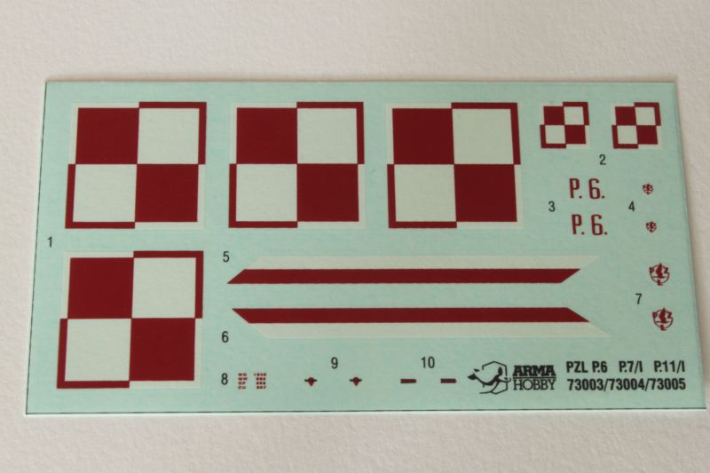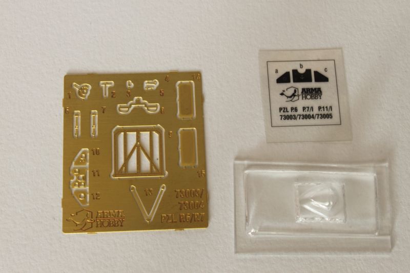 Elementy żywiczne uzupełniają multimedia w postaci fototrawionej blaszki, na której znajdują się tablica przyrządów, wręga, pasy oraz kilka drobiazgów podnoszących estetykę budowanej miniatury. Blaszkę uzupełnia klisza z zegarami oraz tłoczony metodą vacu wiatrochron. W obu zestawach dysponujemy tym samym zestawem dodatków. Podobnie jest z kalkomanią, która jest dobrze znana z modelu P.11/I. Wykorzystamy tylko, to co jest potrzebne przy konkretnym modelu.