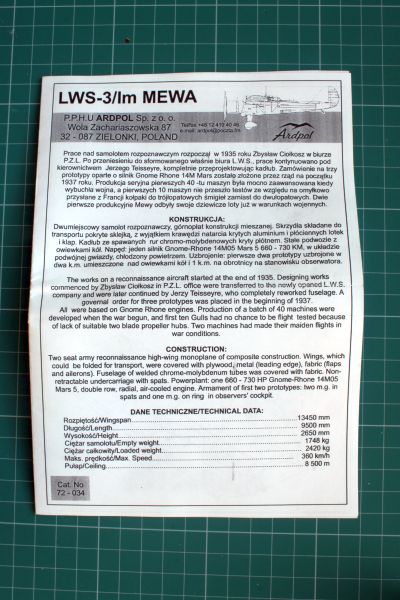 Zazwyczaj w formie recenzji prezentujemy modelarskie nowości, ale zdarza się czasem prezentować zestawy starsze, będące na rynku od jakiegoś czasu, ale na tyle ciekawe, że warte przypomnienia. Tak jest tym razem, dlatego, że na warsztatach króluje Polski Wrzesień 1939r. Powstają kolejne modele Karasi , PZL P.7a, czasem ktoś sięgnie po modele Mierage w skali 1/48. Wszyscy czekają na nowe modele Łosia i P.11c, które to są w różnym stopniu projektowania. Chciałbym przypomnieć o modelu kto, wie czy nie najładniejszego samolotu jaki skonstruowano w Polsce przed wybuchem II Wojny Światowej. Mowa tu o samolocie patrolowym LWS 3 Mewa. Zestaw umożliwiający budowę tego samolotu w skali 1/72 swego czasu opracowała i wyprodukowała firma Ardpol. Są to właściwie dwa zestawy, jeden wariant w wersji kołowej, który wszedł do produkcji, drugi w wersji pływakowej, który z chwilą wybuchu wojny był dopiero w fazie konstruowania. Model lądowej Mewy uzyskałem swego czasu w drodze wymiany kolekcjonerskiej (jeszcze raz dzięki, Mariusz!) i on będzie przedmiotem recenzji.