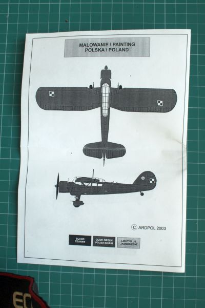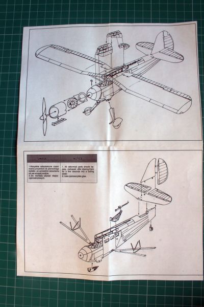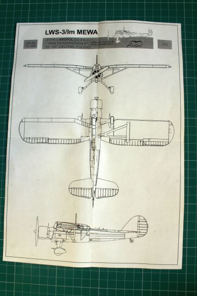 Instrukcja ma postać czarno - białej ulotki. znajdujemy w niej wszystko co jest potrzebne, czyli czytelne rysunki instrukcyjne, schemat malowania i co ważne plan generalny Mewy narysowany w skali 1/72, co bardzo ułatwi nam "łapanie" geometrii budowanej przez nas repliki. Na pierwszej stronie instrukcji producent zamieścił krótka historię i opis techniczny samolotu, w języku polskim i angielskim.