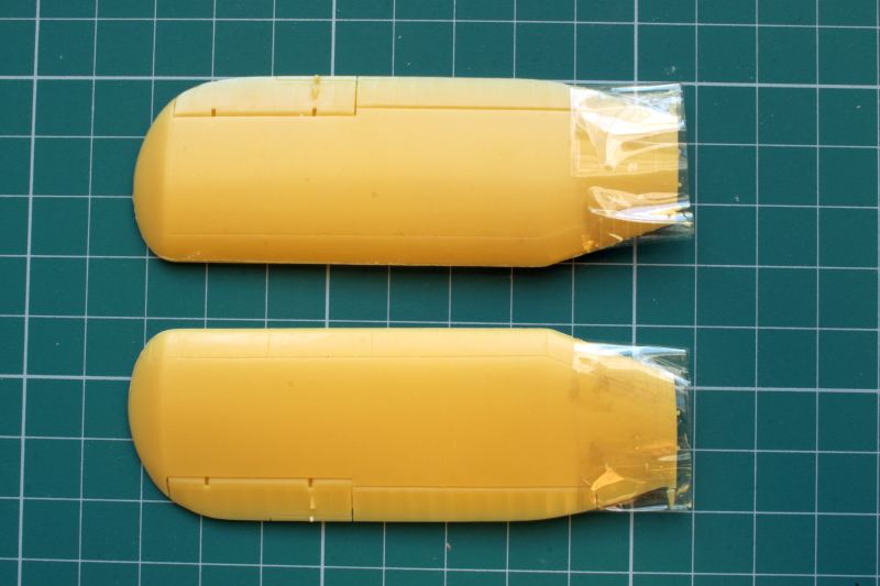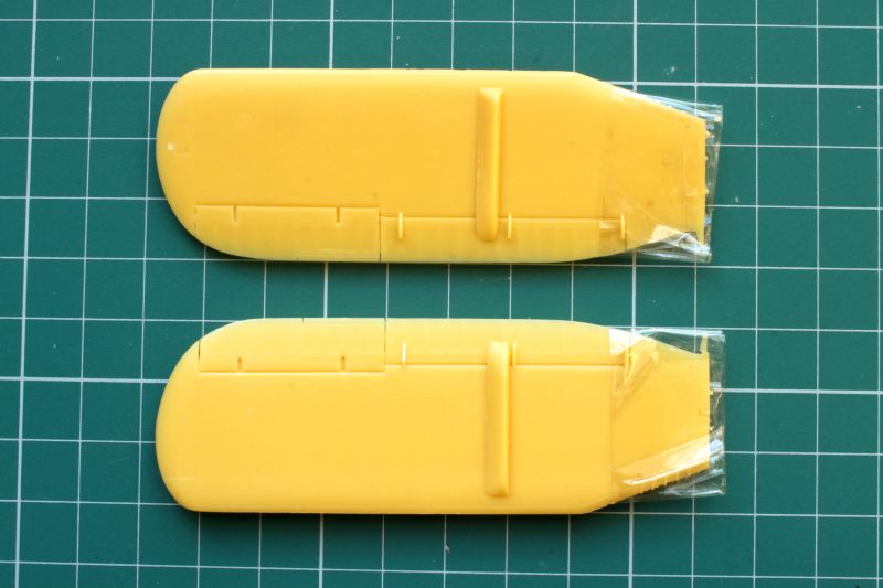 Wycinania nie wymagają także płaty. Wykonano je jako pojedyncze elementy, razem ze slotami, klapami i lotkami. Chcących wykonać je jako wychylone, czeka zatem stosowna przeróbka. Krawędzie spływu przy kabinie zabezpieczono przed odłamaniem kawałkami taśmy klejącej.
