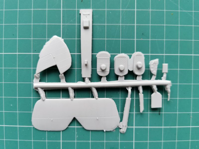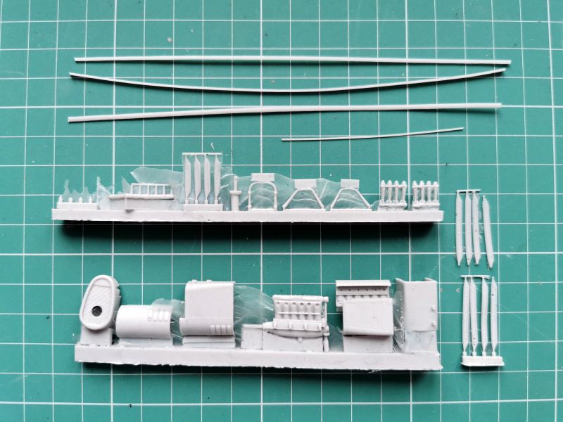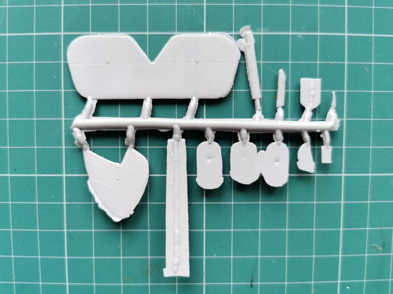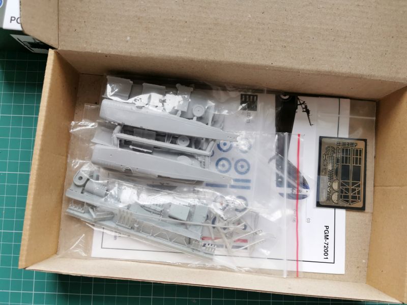 Zawartość pudełka stanową torebki w których znajdują się elementy plastikowe stanowiące zasadniczą część zestawu. Wykonano je z jasno szarego tworzywa, zaś niemal każda część wymaga solidnej obróbki. W kolejnej torebce znajdują się wspomniane odlewy z białego metalu, kolejna to żywice oraz profile. W ostatniej niewielkiej torebce znajduje się blaszka fototrawiona, zaś całość uzupełnia instrukcja i kalkomania.