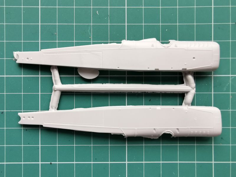 W przypadku elementów plastikowych, trudno powiedzieć, że są one w ramkach wtryskowych, nie są to też „gałązki” znane naszego rodzimego odpowiednika Pegasusa, czyli Hit-Kit. Powiedzmy, że są to wypraski. Na pierwszej z nich znajdują się połówki kadłuba. Przy pierwszym zetknięciu nie wygląda to najlepiej. Sporo nadlewek ukrywa, całkiem niezłe odwzorowanie faktury powierzchni i szczegóły. Natomiast w środku nie ma praktycznie nic, powierzchnia jest niestety nie równa. Trzeba będzie popracować także i tam. Warto też przeszlifować miejsca łączenia połówek kadłuba z sobą. Najlepiej zrobić to na większej kostce ściernej lub arkuszu. Ułatwimy sobie w ten sposób montaż kadłuba w całość.