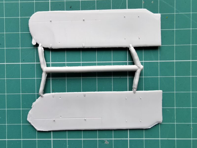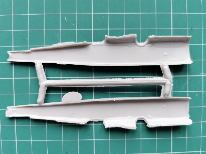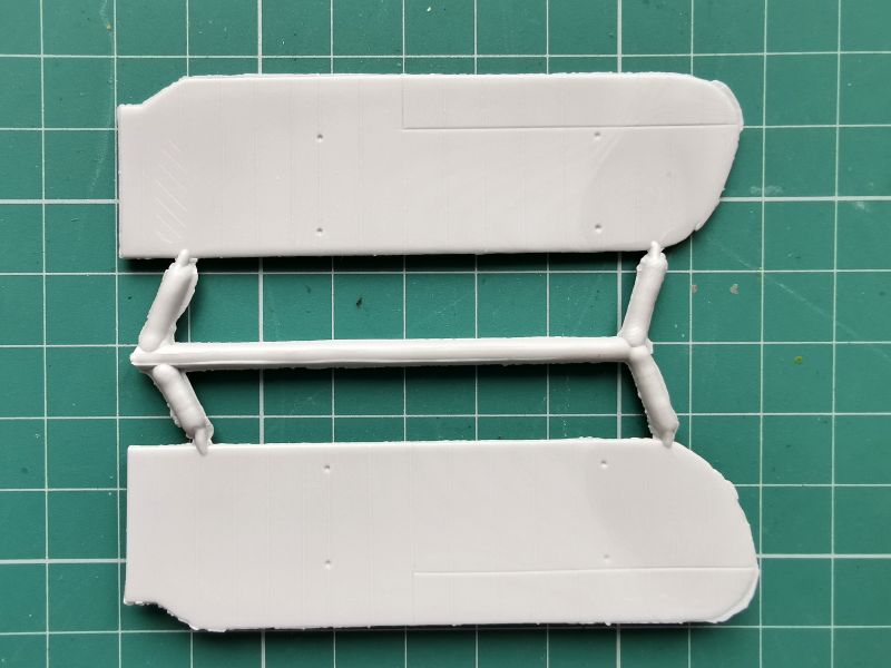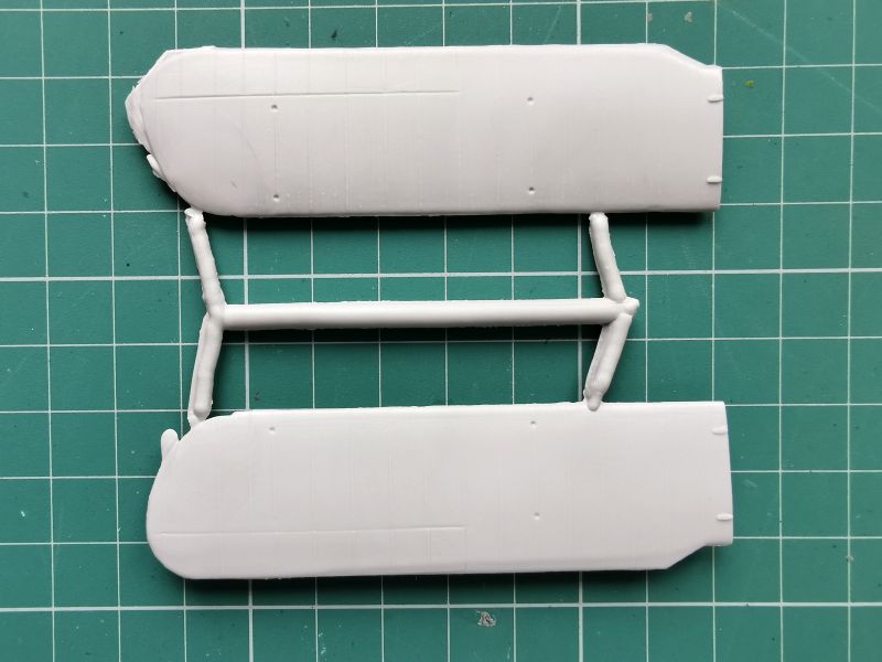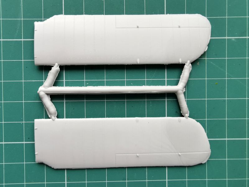 Kolejne dwie wypraski to skrzydła. W ich przypadku także jest wskazana obróbka krawędzi, bo w miejscu styku połówek form, nadlewki są okrutne. Zwrócić trzeba także uwagę na obróbkę miejsc styku dolnych skrzydeł z kadłubem i górnych z baldachimem. Trzeba zadbać aby te powierzchnie były równo obrobione i nadać im odpowiedni kąt. Faktura powierzchni ma postać cienkich wypukłych linii poprowadzonych wzdłuż żeber, wygląda nieźle i taką ją raczej zostawię. Lotki za to zrobię jako wychylone, zaprojektowano je bowiem jako integralne części skrzydeł. Oczywiście zaznaczono miejsca wklejenia zastrzałów, ale także wyrzutników bombowych i innego wyposażenia.
