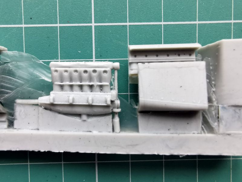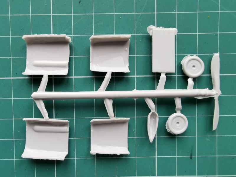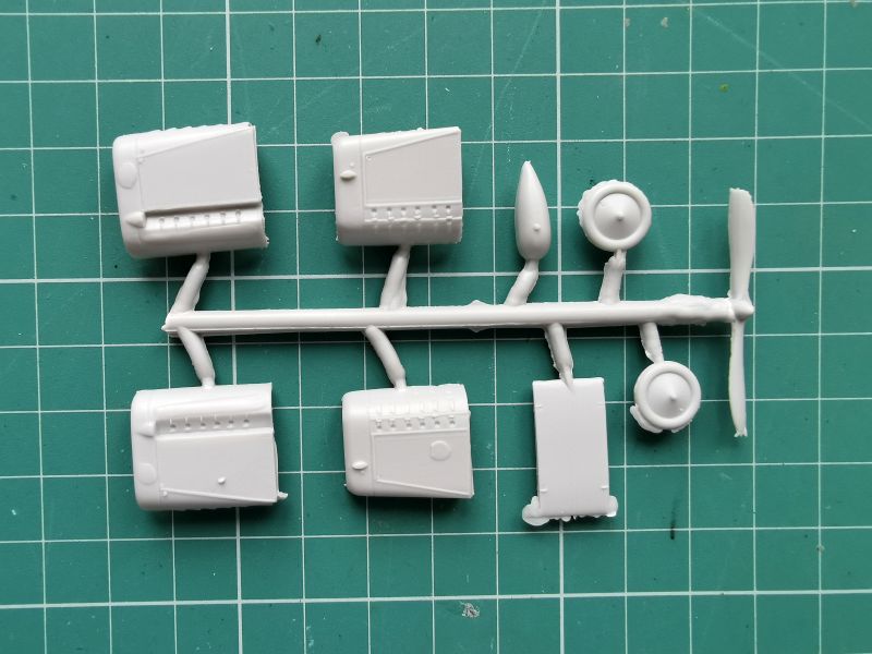 Powyżej wspomniałem o trzech rodzajach chłodnic silnika. Dlatego tak się stało, że nasza miniatura ma możliwość zabudowania jednego z trzech silników do wyboru. Są to Siddley BHP Puma, Rolls Royce Eagle oraz U.S. Liberty V12. Pierwszy z nich stanowi integralną część połówek kadłuba, dwa pozostałe znajdują się na kolejnej wyprasce wraz z dwułopatowym śmigłem, kołami, baldachimem oraz opływową obudową nie wiem czego, którą należy zamontować pod górnym płatem. O konieczności dokładnej obróbki tych elementów wspominam z kronikarskiego obowiązku.