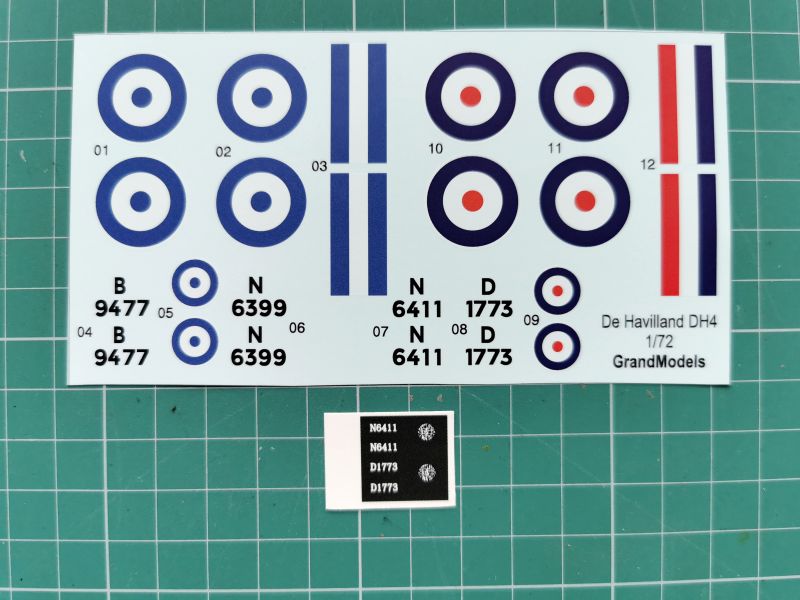 Kalkomania umożliwia wykonanie modelu w malowaniu greckim i brytyjskim. Są to dwa arkusiki. Na większym z nich umieszczono znaki przynależności państwowej oraz numery indywidualne. Na każde malowanie przypadają po dwa. Na mniejszym znajduje się coś w rodzaju stencili, do wykorzystania w wariancie brytyjskim. Wydruk kalkomanii sprawia dobre wrażenie, zresztą jak we wszystkich modelach Grand Models, kalki stanowiły mocną stronę. Schematy malowania ograniczyły się natomiast do sylwetek bocznych wydrukowanych w kolorze na kredowej kartce.
