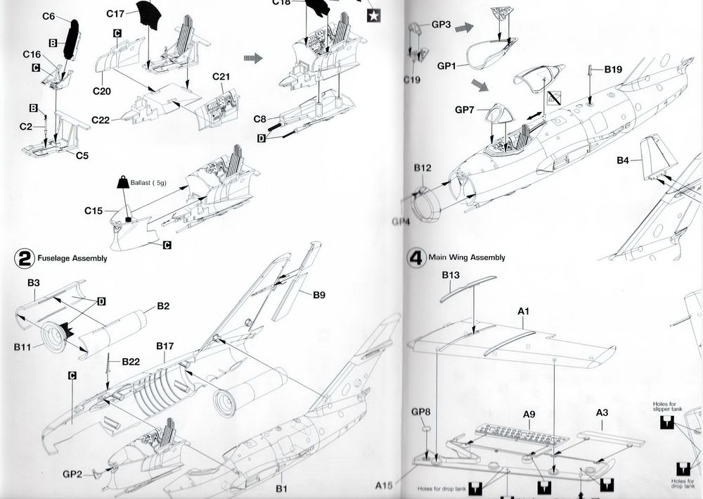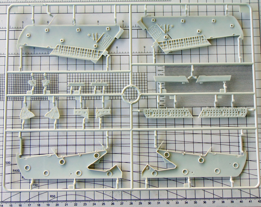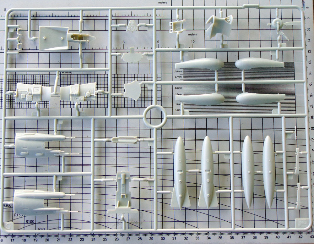 W prezentowanym modelu znajdziemy trzy wypraski z szarego tworzywa o w miarę delikatnych liniach podziału jednak bez charakterystycznego nitowania tych samolotów. Można to uważać za pewien błąd jednak doświadczony modelarz bez problemów powinien sobie z wykonaniem wspomnianych nitów poradzić, tym bardziej że bryła samolotu nie jest skomplikowana. Same wypraski prezentują się w przyzwoity sposób, w bez nadlewek, przesunięć formy czy nadmiernych śladów po wypychaczach.