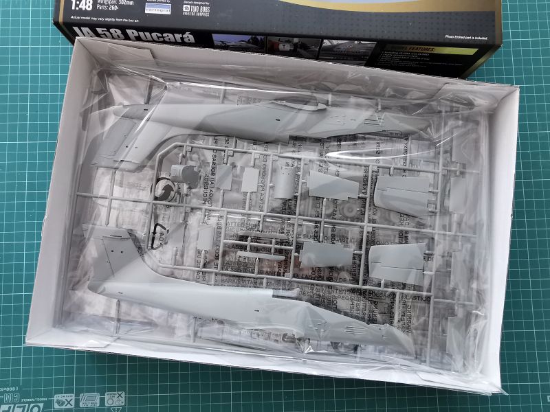 Model Pucary został wydany w linii Kinetic Gold, o czym świadczy logo na pudełku i jego szata graficzna, bardzo estetyczna i miła dla oka. Wieko pudełko zdobi efektowny boxart przedstawiający naszego bohatera w barwach argentyńskich. W pudełku znajdziemy pięć ramek z jasno szergo polistyrenu, jedną przezroczystą, które uzupełnia blaszka fototrawiona oraz kalkomania. Producent w informacji na pudełku deklaruje, że zestaw liczy sobie ponad 260 elementów. Pierwsze wrażenie jest bardzo pozytywne, pięknie wykonana bryła oraz detale modelu.