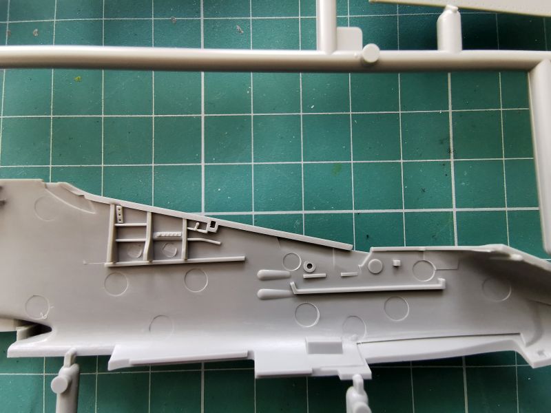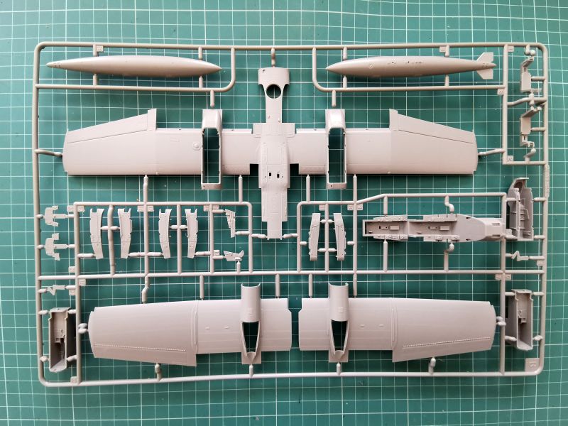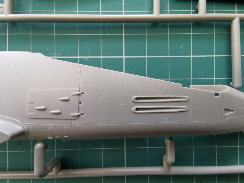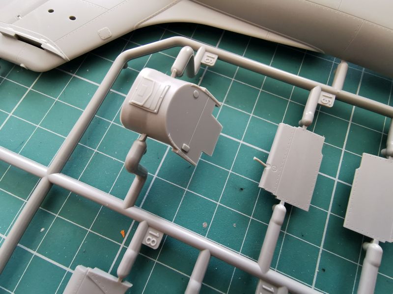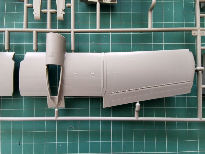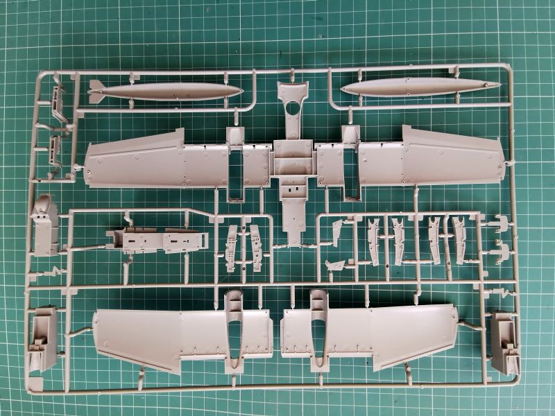 Ramka oznaczona jako „A” zawiera kadłub, który ma klasyczny podział na dwie połówki. Ponadto znajdują się niej klapy oraz pokrywy luku podwozia przedniego. Model ma wklęsłe linie podziału blach oraz w niektórych miejscach zaznaczone szwy nitowe. Ponadto bardzo realistycznie wykonano takie rzeczy, jak łączenie blach na zakładkę, czy też wszelkiego rodzaju panele i pokrywy. Ster wysokości oraz ster kierunku nie są oddzielnymi elementami, ale wykonano je w taki sposób, że wystarczy delikatny wasch po pomalowaniu, żeby uzyskać efekt oddzielnych elementów. Jak zaznaczyłem powyżej jedynie klapy można wykonać w pozycji wychylonej. Zdjęcia prawdziwych maszyn, których w sieci jest dość sporo wyraźnie wskazują, że nawet na postoju, klapy zazwyczaj wychylone były w dół. Stery oraz lotki są ustawione zazwyczaj na „0” i tak przedstawił to projektant modelu. Skupiłem się na klapach a tymczasem, sporo dzieje się także wewnątrz kadłuba. Kokpit ma bardzo ładnie i szczegółowo odtworzone szczegóły na burtach. Są tu także jednak ślady po wypychaczach. I co teraz ?! A no nic. Są i tyle. Co z nimi zrobię zadecyduję dopiero podczas budowy. Poza tym Kinetic to nie jest polski producent, więc pewnie przejdzie to bez echa. Co innego gdyby takiej zbrodni dopuściła się na przykład Arma Hobby lub IBG Models… No, zapłonęły by stosy.