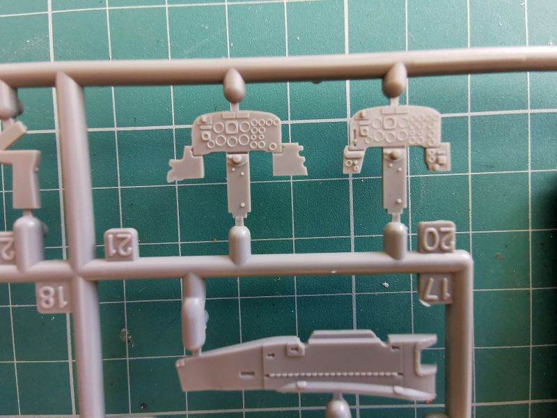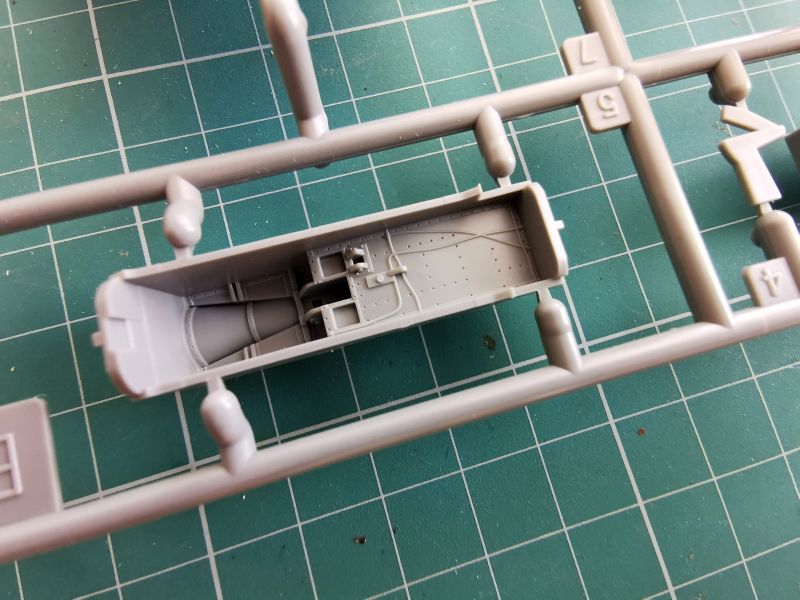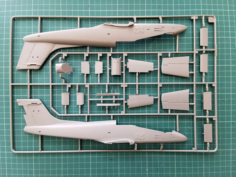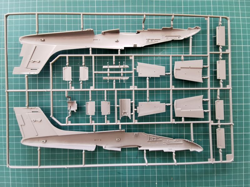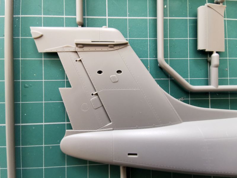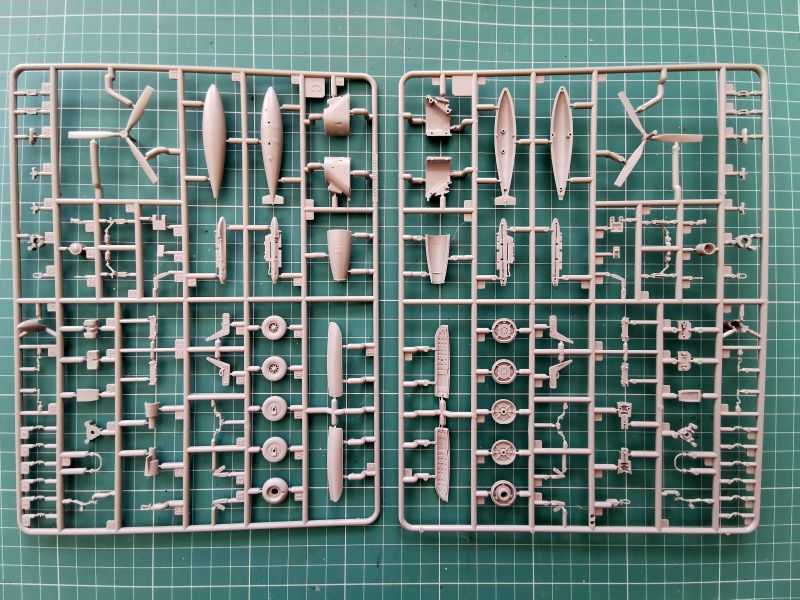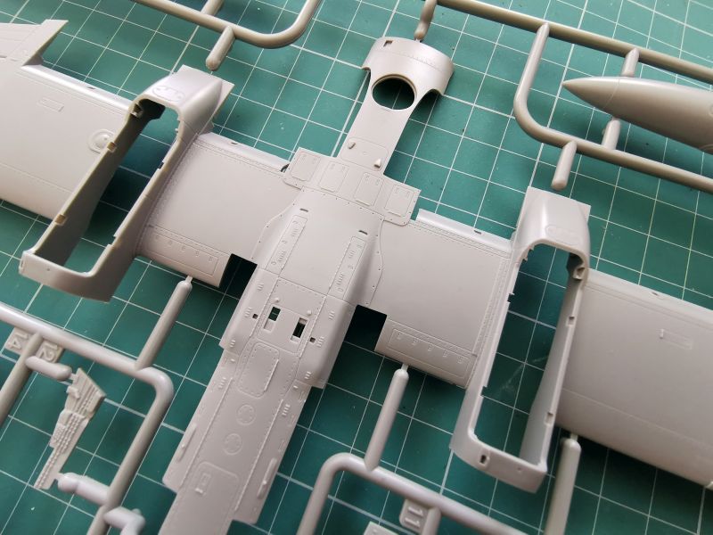 Ramka oznaczona jako „A” zawiera kadłub, który ma klasyczny podział na dwie połówki. Ponadto znajdują się niej klapy oraz pokrywy luku podwozia przedniego. Model ma wklęsłe linie podziału blach oraz w niektórych miejscach zaznaczone szwy nitowe. Ponadto bardzo realistycznie wykonano takie rzeczy, jak łączenie blach na zakładkę, czy też wszelkiego rodzaju panele i pokrywy. Ster wysokości oraz ster kierunku nie są oddzielnymi elementami, ale wykonano je w taki sposób, że wystarczy delikatny wasch po pomalowaniu, żeby uzyskać efekt oddzielnych elementów. Jak zaznaczyłem powyżej jedynie klapy można wykonać w pozycji wychylonej. Zdjęcia prawdziwych maszyn, których w sieci jest dość sporo wyraźnie wskazują, że nawet na postoju, klapy zazwyczaj wychylone były w dół. Stery oraz lotki są ustawione zazwyczaj na „0” i tak przedstawił to projektant modelu. Skupiłem się na klapach a tymczasem, sporo dzieje się także wewnątrz kadłuba. Kokpit ma bardzo ładnie i szczegółowo odtworzone szczegóły na burtach. Są tu także jednak ślady po wypychaczach. I co teraz ?! A no nic. Są i tyle. Co z nimi zrobię zadecyduję dopiero podczas budowy. Poza tym Kinetic to nie jest polski producent, więc pewnie przejdzie to bez echa. Co innego gdyby takiej zbrodni dopuściła się na przykład Arma Hobby lub IBG Models… No, zapłonęły by stosy.