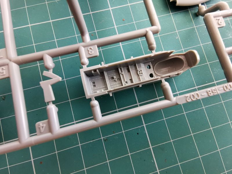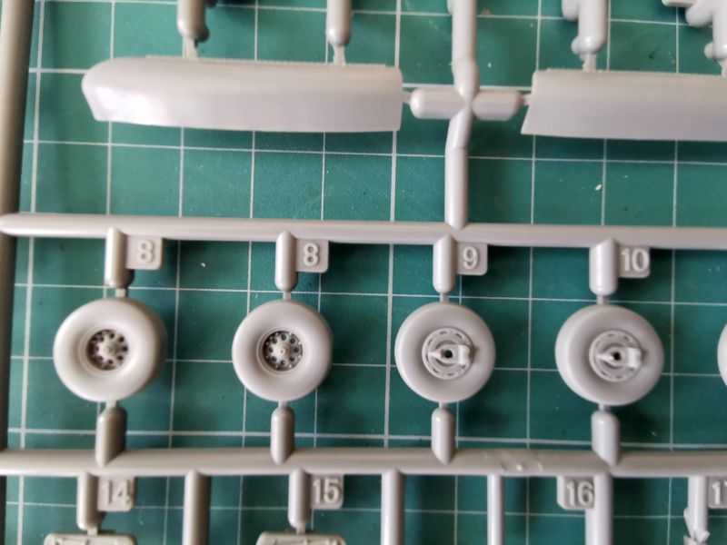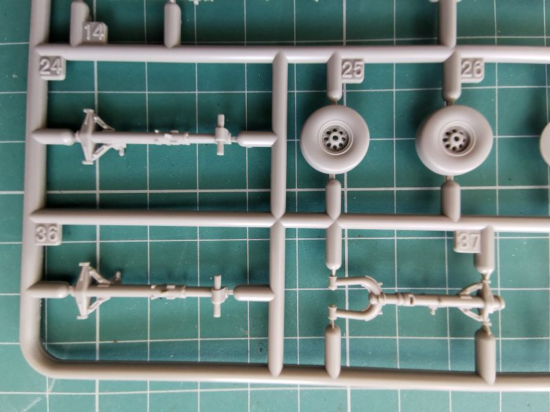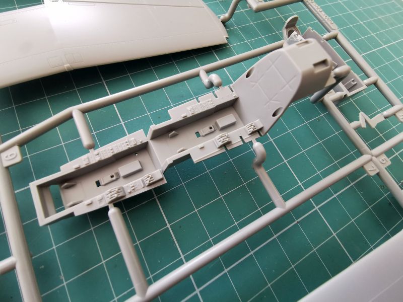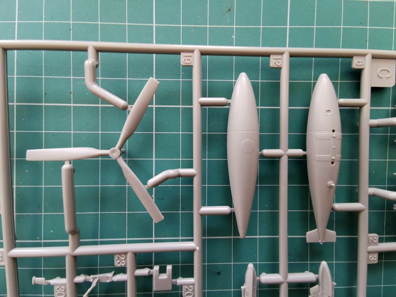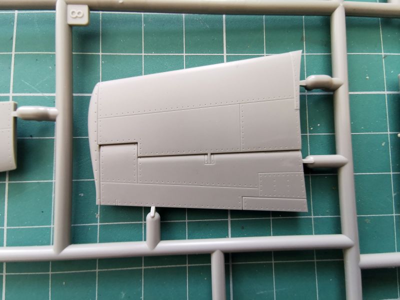 Tyle tytułem dygresji o paleniu czarownic, tymczasem mamy ramkę „B”. Mamy na niej podzespoły skrzydeł, luki podwozia, detale kokpitu, podwieszenia oraz centralny zbiornik podkadłubowy. Także tę ramkę przyjemnie wziąć do ręki, bo sposób odwzorowania detali jest po prostu wspaniały, zresztą dziwnie by było, gdyby było inaczej. Skrzydła wystarczy skleić w całość i zamontować w kadłubie, kabina, no może wymagać dołożenia kilku drobnych detali, jak ktoś chce, tablice przyrządów widziałem lepiej wykonane, ale te są zupełnie do przyjęcia. Natomiast wnęki luków podwozia z całą strukturą ich konstrukcji a także przewodami instalacji prezentują poziom osiągalny niedawno tylko dla producentów detali żywicznych. Można oczywiście tam coś dołożyć ale i bez ingerencji modelarza prezentują się znakomicie.