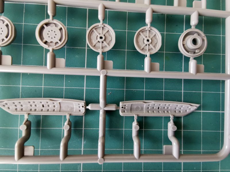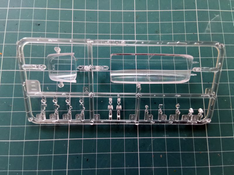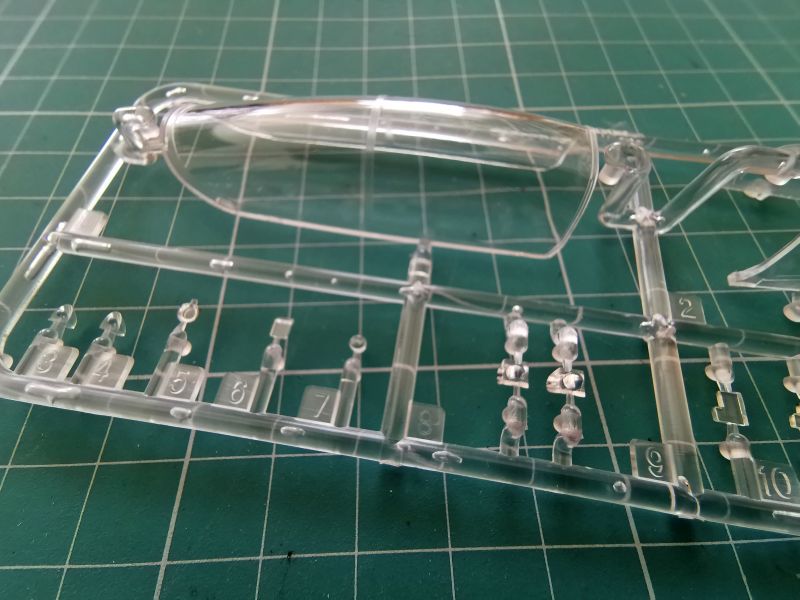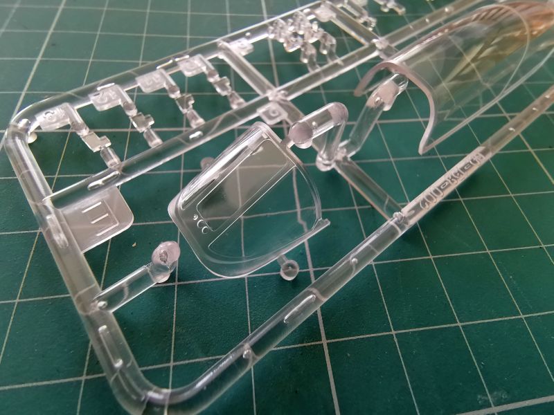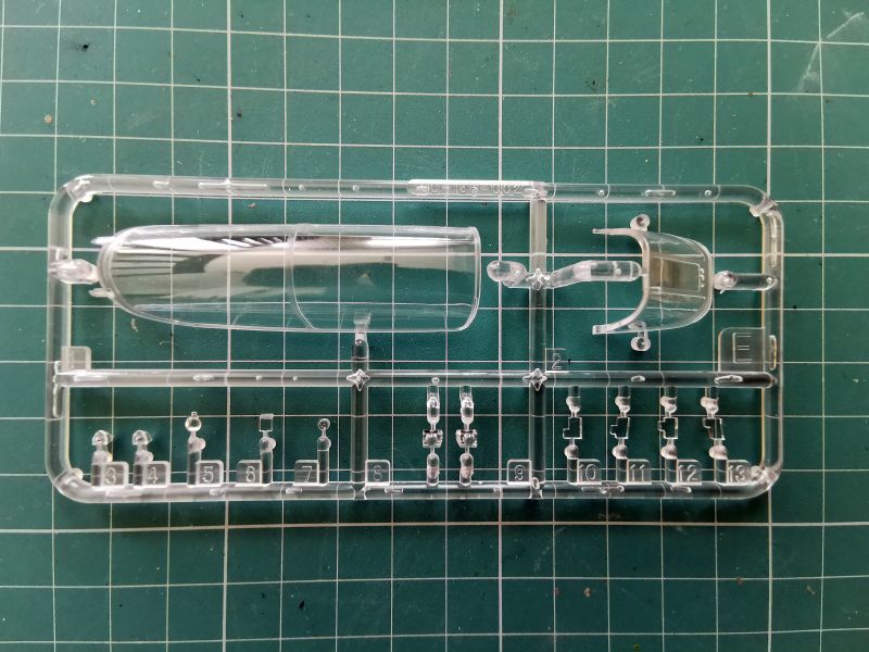 Ramka „E” to elementy przezroczyste. Poza osłoną kabiny mamy tutaj całkiem sporą ilość kloszy od różnego rodzaju lamp oraz przyrządy celownicze. Osłona kabiny jest dzielona i można ją wykonać w pozycji otwartej, aby zaprezentować wnętrze kokpitu. Nie można nic zarzucić jakości jej wykonania. Szkło jest cieniutkie, przejrzyste i pozbawione efektu soczewki, zaś ramy kabiny poprowadzone równo i wyraźnie.