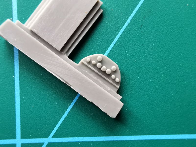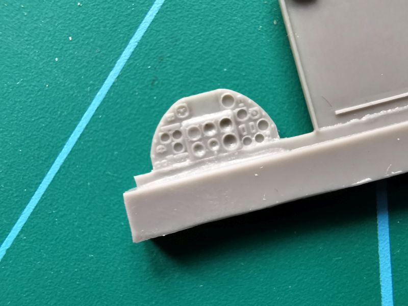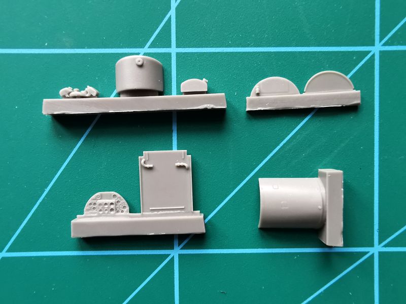 Są to cztery odlewy z jasnoszarej żywicy, w sumie 10 elementów. Jakość tych odlewów jest dobra, producent zadbał o to by detale były wyraźne i nie było paskudnych niespodzianek w postaci niedolewek czy pęcherzyków powietrza. Zestaw składa się ze zbiornika wraz z podstawą, do tego dochodzi osłona, dwie wręgi, tablica przyrządów oraz dwa drobne detale. Do tego kilka detali musimy dorobić samemu. To elementy konstrukcji samolotu, które producent sugeruje wykonać z plastikowych prętów. Jeśli dołożymy do tego jakieś przewody, da to nam w sumie dość dokładnie wypełnioną przestrzeń po usunięciu pokrywy znajdującej się przed kabiną pilota. Ważnym detalem w tej układance jest tablica przyrządów a dokładnie jej tylna część z zaznaczonymi puszkami poszczególnych zegarów. Powinna być doskonale widoczna za zbiornikiem, a jeśli dołożymy przewody do poszczególnych puszek, będziemy mieli detalowany pięknie ten fragment modelu. Przednia część tablicy przyrządów daje nam kilka opcji. Możemy wykorzystać ją tak, jak przewidział producent, możemy też w dowolny sposób ją pożenić, czy to tablica zestawową, czy też z Yahu bądź Eduarda.