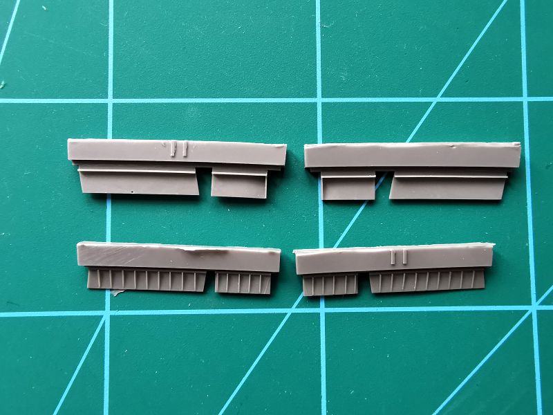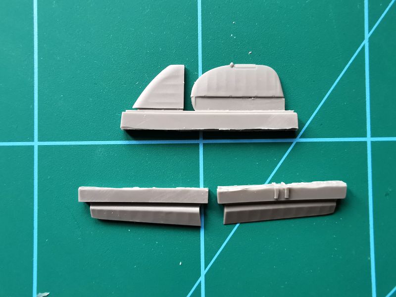 Składa się on z siedmiu odlewów z jasnoszarej żywicy. Ich jakość jest identyczna, jak w przypadku zestawu do zabudowy rezerwowego zbiornika z paliwem, czyli dobra. Osobiście lubię, jak model ma wychylone lotki czy otwarte klapy i często dokonuje stosownych korekt w swoich miniaturach. Nie przepadam jednak za klapami fot otrawionymi, ostatnio robię je od podstaw w cienkiego hipsu. Propozycja CMK jest adresowana do tych, co nie chcą się narobić, a mieć doskonały efekt. Ot, wyciąć co trzeba w modelu, wyciąć elementy żywiczne z klocków wlewowych, obrobić, pomalować i złożyć do kupy. Tyle w temacie klap. Do tego otrzymujemy lotki oraz alternatywny statecznik pionowy ze sterem kierunku jako osobnym elementem. Producent darował sobie natomiast statecznik poziomy, bo przecież już taki w zestawie, ze sterem wysokości jako oddzielnym elementem. CMK zasługuje tu niewątpliwie na pochwałę, bo na swoich zamiennikach odtworzyło fakturę powierzchni krytych płótnem dokładnie w taki sam sposób jak to zrobiła Arma Hobby w swoim zestawie. Bez żadnego kombinowania.