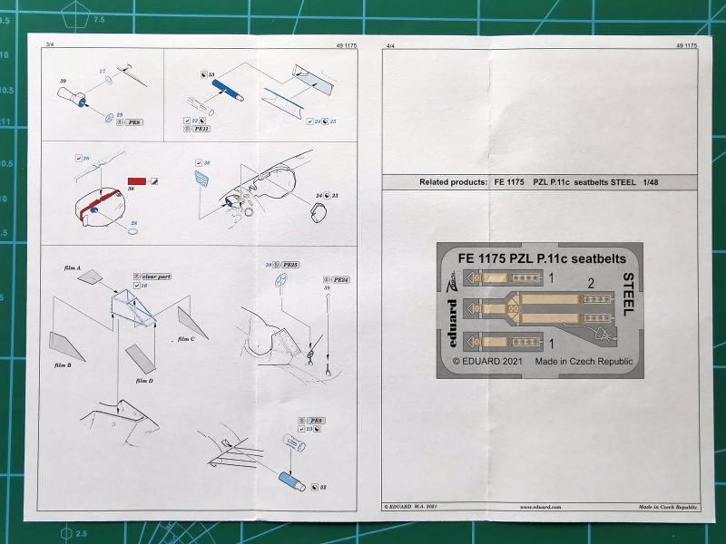 W przypadku pasów do modelu P.11c jest niewielka kolorowa blaszka. Pasy wykonano bardzo ładnie, dobrze odwzorowują oryginał jeśli chodzi o kolorystykę i detale. Jak je zamontować dowiemy się z instrukcji w formie niewielkiej kolorowej ulotki.