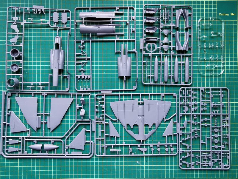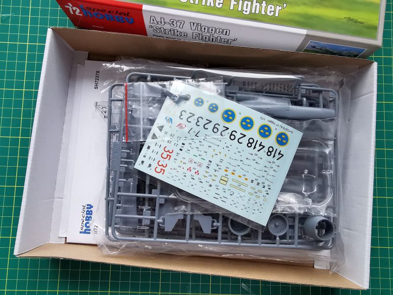 Nie tylko ładny boxart przykuwa uwagę. Także to, że pudełko ledwo się domyka, bo części jest naprawdę sporo. To pięć ramek z szarego polistyrenu, jedna przezroczysta a na niech rozmieszczona przeszło setka części. Ramki w poszczególnych zestawach różnią się oczywiście pomiędzy sobą, co wynika z wersji samolotu. Taki komplet występował już w wydanym w 2020 r. zestawie podwójnym SH72411. Byłą tam także odmiana dwumiejscowa oraz monografia. Model, który właśnie oglądamy nie jest typowym short runem, od pewnego czasu Special Hobby opracowuje swoje modele cyfrowo i do takiej właśnie grupy należą wszystkie wersje Viggena, jakie dotychczas wydano. Oznacza to, że detal jest wyraźny i lepiej wykonany, zaś ramki nie rażą topornością jak w większości modeli starszej generacji. Widać także, że producent korzysta z form suwakowych.