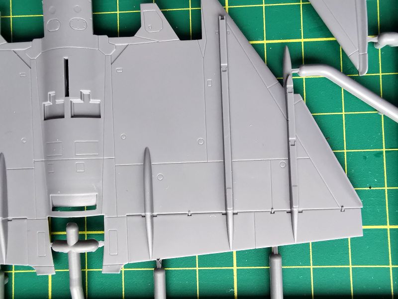 Równie dobrze wypadają detale wnętrza takie jak dysza oraz pozostałe podzespoły silnika takie jak odwracacz ciągu, czy też hamulce aerodynamiczne. Możemy także wykonać moduł RAT w pozycji otwartej, jeśli natomiast ktoś chciałby okrasić budowaną miniaturę, żywicznymi ingrediencjami z oferty firmy CMK, jest tego naprawdę sporo w tym zasobniki niekierowanych pocisków rakietowych Bofors m/70, które często przenosiła odmiana AJ-37. Poruszyłem temat uzbrojenia podwieszanego nieprzypadkowo, ponieważ firma Special Hobby przy swoich modelach Viggenów zastosowała patent polegający na tym, że uzbrojenia podwieszanego po prostu nie ma i to do modelarza należy w jaki sposób je skonfiguruje, czy to za pomocą zakupu odpowiednich dodatków, czy wykorzystaniu pozostałości po poprzednich projektach. W myśliwsko – bombowej wersji Viggena do dyspozycji mamy jedynie dwa podwieszane zbiorniki paliwa, z których i tak wykorzystamy jeden.