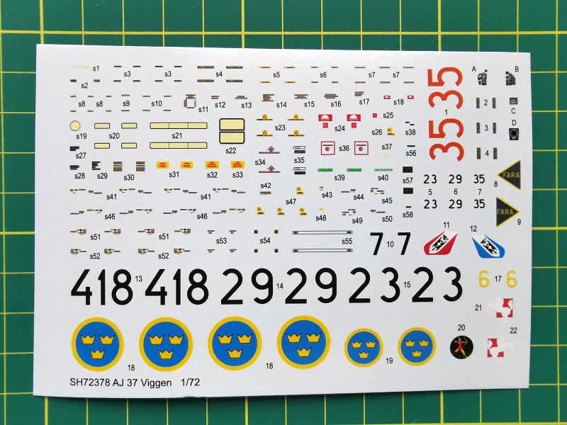 Ponieważ żaden z modeli Viggenów oferowanych przez Special Hobby nie miał w standardzie dodatków w postaci blaszek fototrawionych czy detali żywicznych, można przyjrzeć się kalkomanii. Jest to arkusik średniej wielkości, zaś na mim znajdują się oznaczenia umożliwiające wykonanie modelu w jednym z trzech malowań, komplet napisów eksploatacyjnych, a także kalkomanie na tablice przyrządów i panele boczne w kokpicie. Nie mam uwag co do jakości druku, kolory są dobrane w sposób prawidłowy, zaś szczegóły wyraźne. Jak będą się nakładać na model, zobaczymy.