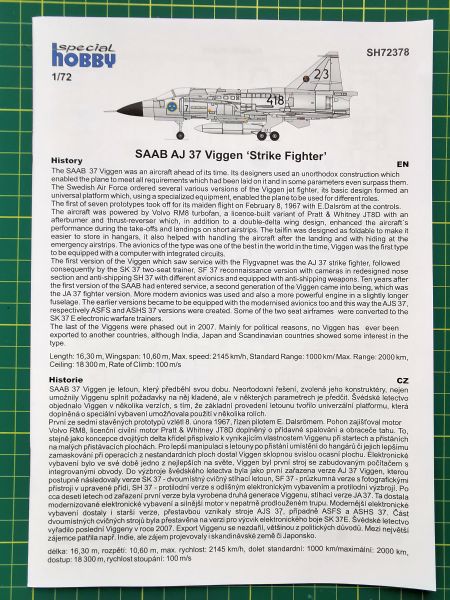 Zanim to jednak nastąpi, nieco historii. W czasach kiedy Viggeny królowały na niebie Skanii, Ångermanlandu czy Gotlandu amatorzy modelarstwa, pragnący miniatury Viggena w podziałce 1/72 mieli do dyspozycji modele Matchboxa, Airfixa, Hasegawy i Hellera, z których ten ostatni był moim zdaniem zdecydowanie najlepszy, a dostać go można do chwili obecnej. Sytuacja zmieniła się w 2018 r. kiedy to powstało zupełnie nowe opracowanie. Wykonała je firma Special Hobby na zlecenie szwedzkiej firmy Tangarus. Rok później pojawił się pierwszy zestaw Viggena wydany już pod czeskim szyldem. Potem przyszły kolejne, zaś omawiana w tym miejscu wersja AJ-37 jest już czwarta. Na samym początku zwraca uwagę bardzo ładny boxart, przedstawiający chwilę startu lub też lądowania na jakimś bliżej nie zidentyfikowanym lotnisku w południowej Szwecji.