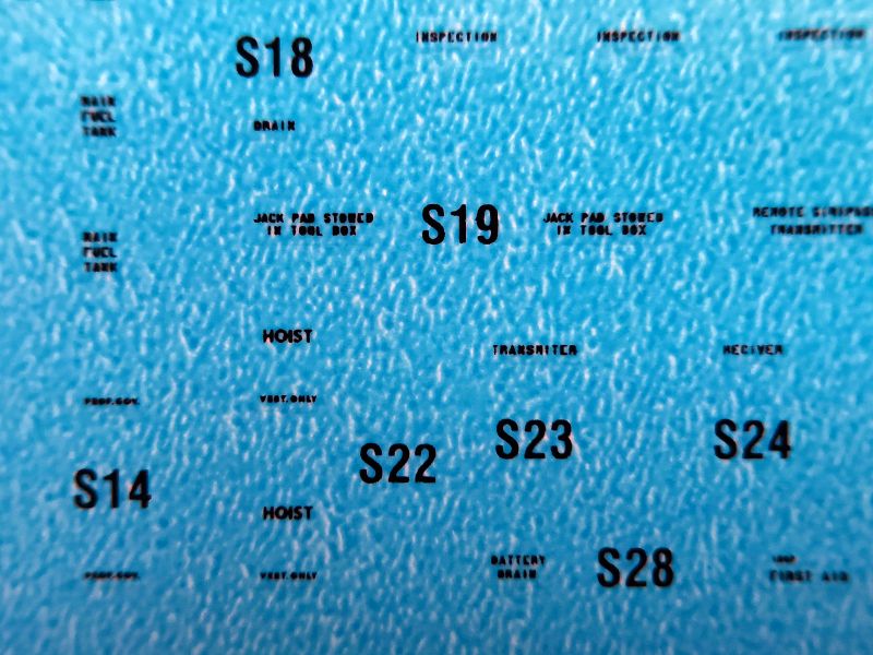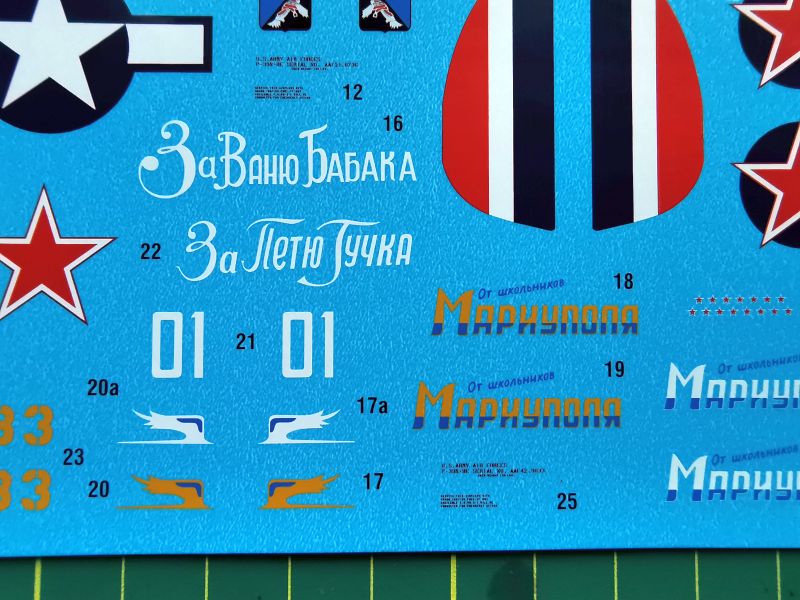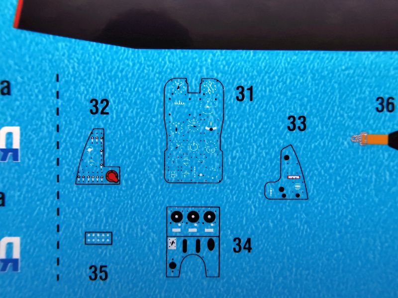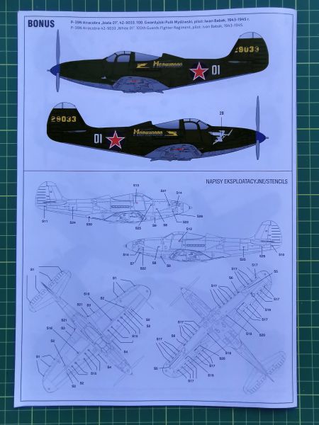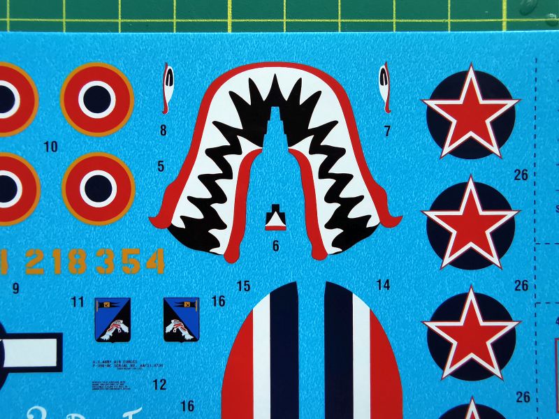 Ponieważ zarówno elementy przezroczyste, maski oraz balast są identyczne jak w P-39Q Od razu przejdę do omawiania kalkomanii. Jest to spory, podłużny arkusz, na którym sporo się dzieje. Znaki, numery, godła no i oczywiście paszcza zostały uzupełnione kompletem napisów eksploatacyjnych i tradycyjnie kalkomaniami do umieszczenia w kokpicie. Wszystko wydrukowane wyraźnie z prawidłową kolorystyką, a nawet najdrobniejsze napisy można przeczytać. Nie ma też żadnych błędów drukarskich. Tym razem drukiem kalkomanii zajął się nasz rodzimy Techmod. Jeśli chodzi o ich stronę techniczną, to jestem raczej spokojny. Wiele razy korzystałem z tych kalkomanii i nie miałem z nimi najmniejszego problemu.