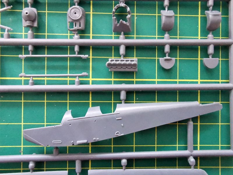 Podstawowe elementy modelu znajdują się na dwóch wypraskach wykonanych z szarego polistyrenu. Na pierwszy rzut oka robią sympatyczne wrażenie, jest to short run, ale wykonany współcześnie, nie wiem czy cyfrowo, ale na bardzo dobrym poziomie, o czym może świadczyć na przykład kadłub. Sporo precyzyjnie odtworzonych detali zewnętrznych, sporo także dzieje się wewnątrz. Jedynie brak kołków pozycjonujących przypomina o technologii wykonania modelu. Z przodu montujemy alternatywne elementy w zależności od wyboru wersji silnikowej. Jeżeli wybierzemy silnik gwiazdowy, przednią część kadłuba należy odciąć. Równie pozytywne wrażenie co kadłub robią wszystkie powierzchnie kryte płótnem, na tej ramce znalazł się górny płat. Mamy do wyboru jego wersję z e slotami lub bez. Opłótnienie wykonane jest w sposób subtelny, bez przegięć w żadną stronę. Także wszelkie drobne detale zostały odtworzone dokładnie i wyraźnie. Uproszczona jest jedynie makieta silnika rzędowego, bo do dyspozycji mamy jedynie górną i przednią jego część. Jeżeli ktoś chciałby wykonać go w pozycji otwartej, musi postarać się o jakiś zamiennik, lub czeka go trochę pracy samodzielnej.