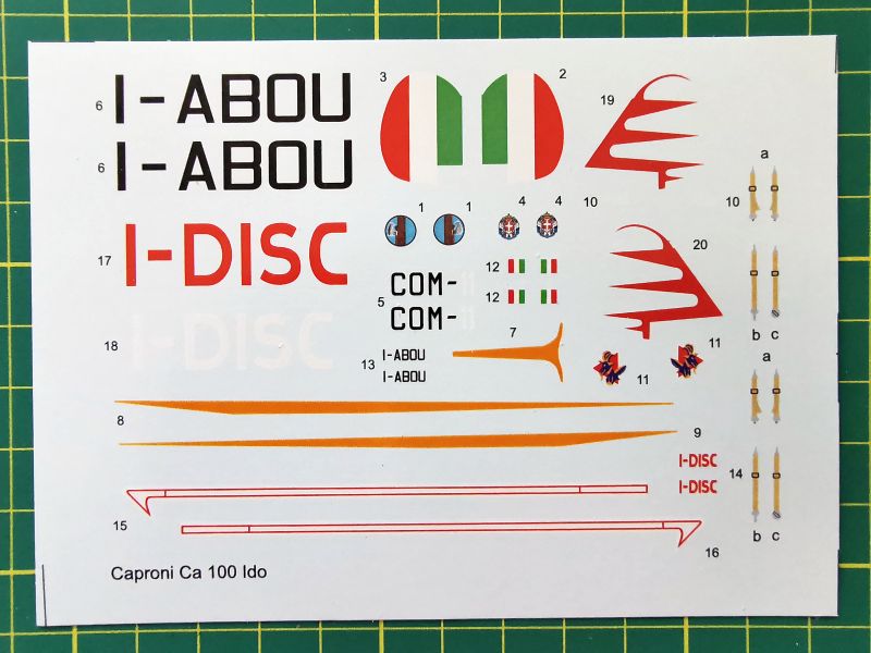 Jak zaznaczyłem powyżej, jedyne różnice pomiędzy poszczególnymi zestawami to kalkomanie i propozycje malowania. Na początek odmiany pływakowe. W przypadku wersji z silnikiem rzędowym, do wyboru mamy aż cztery warianty, trzy historyczne i jeden współczesny - ten oznaczony jako pierwszy. Ta ilość opcji przełożyła się oczywiście na wielkość arkusza kalkomanii, jest on średniej wielkości w przeciwieństwie do tego, jaki znajdziemy w pudełku z odmianą pływakową z silnikiem rzędowym. Tu jest tylko jeden wariant. W przypadku obu odmian pływakowych do wyboru mamy tylko malowania włoskie cywilne i wojskowe.
