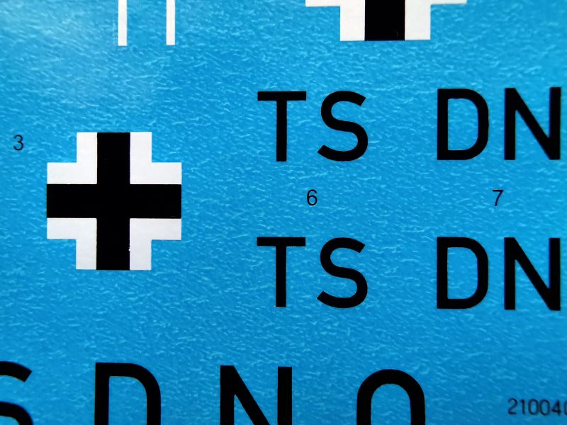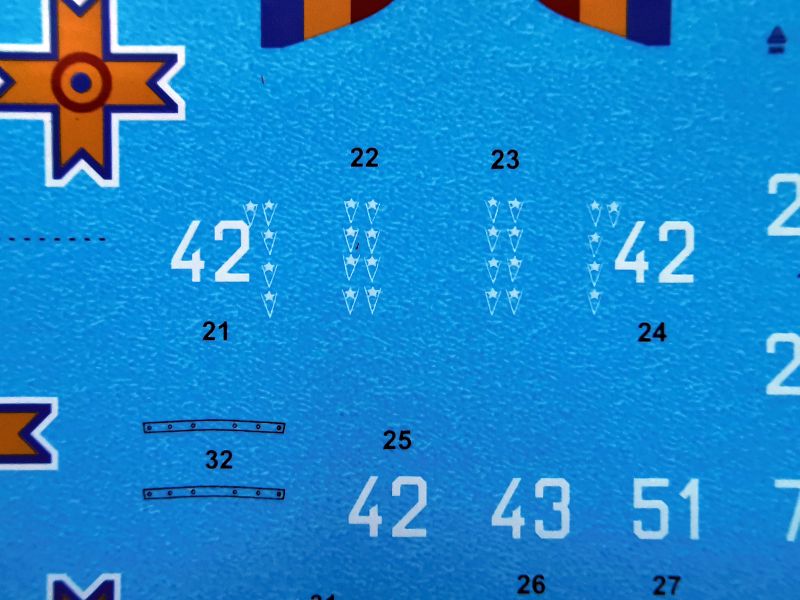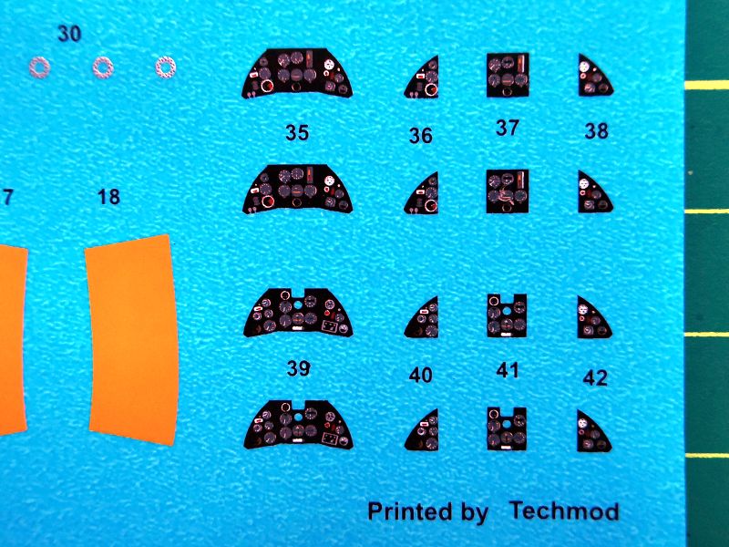 Kalkomania to dwa arkusze, jeden mniejszy z numerami i napisami eksploatacyjnymi. Identyczny jak w obu poprzednich zestawach oraz drugi, całkiem słusznych rozmiarów, na którym znajdziemy oznaczenia, numery godła a także oznaczenia szybkiej identyfikacji w postaci pasów na kadłub. Wiem, wielu modelarzy woli je malować, ja jednak wolę je mieć na kalkomanii. Przynajmniej jestem spokojny o dobór kolorów, w tym wypadku żółtego. Są też tablice przyrządów, całe i dzielone, w dwóch wariantach po dwa egzemplarze.