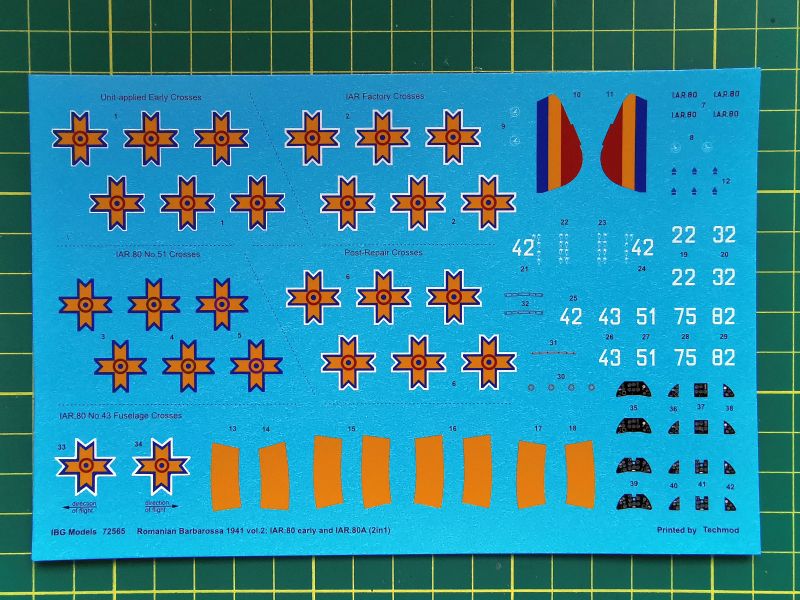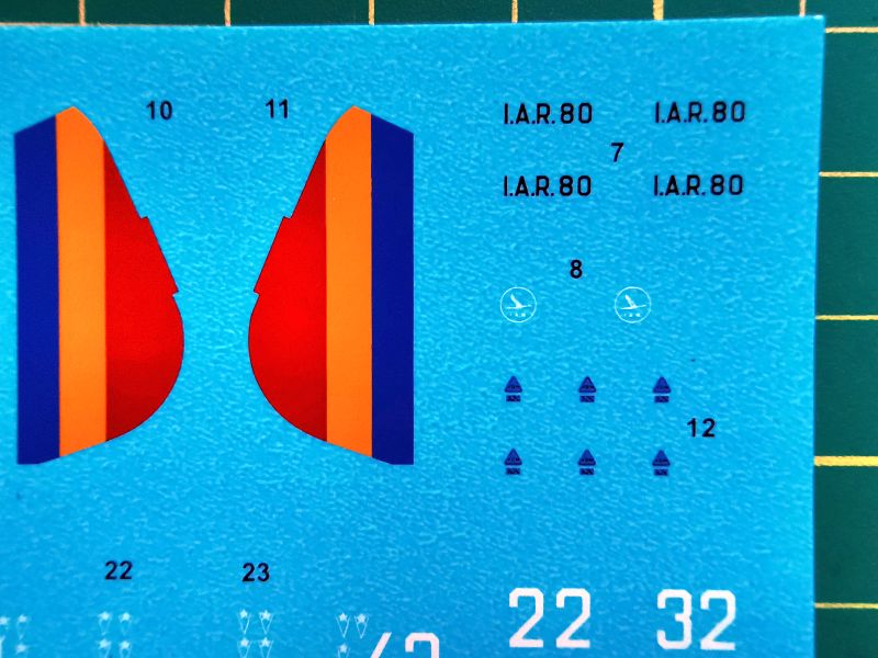 Kalkomania to patent znany z wcześniejszych zestawów a także modeli samolotów myśliwskich IAR 80/81. Arkusik zawierający stencile i wyposażenie kabiny wchodzący w skład każdego zestawu oraz nieco większy z oznaczeniami, kodami literowymi oraz numerami na statecznik pionowy.