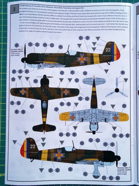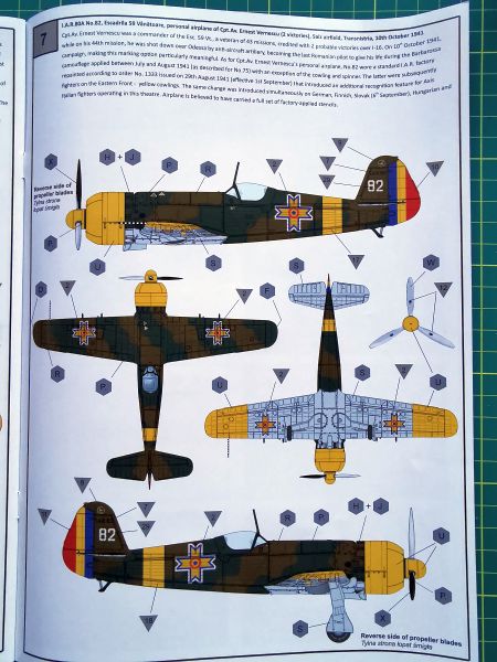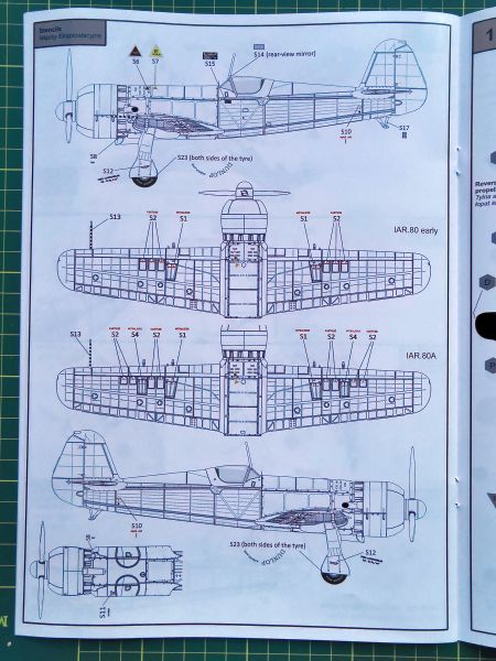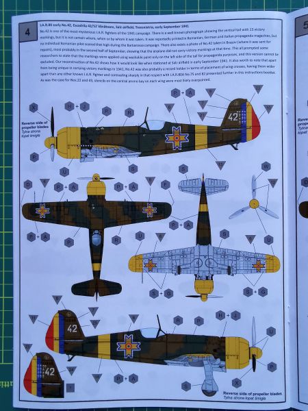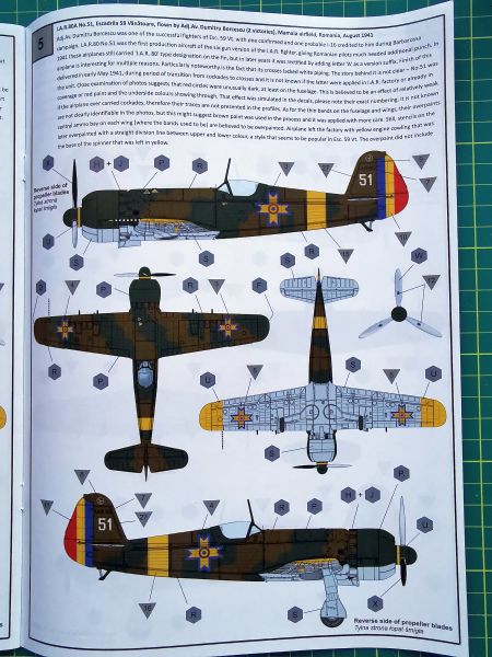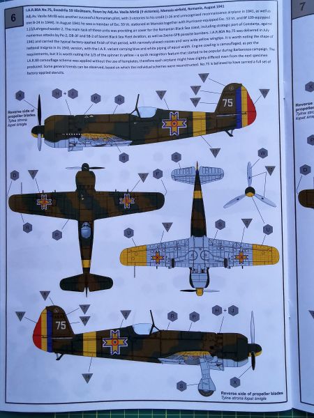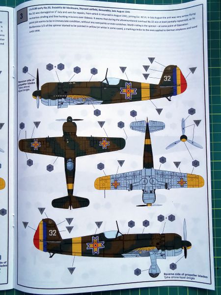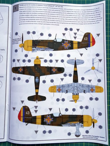 Producent proponuje aż siedem wariantów malowania, przy czym wszystkie są dość podobne do siebie, ponieważ wszystkie pochodzą, jak wskazuje tytuł zestawu na Operację Barbarossa z 1941 r. Cztery z nich to wczesna odmiana IAR 80, trzy kolejne to IAR 80A. Kolorowe plansze ze poszczególnymi malowaniami poprzedzają schematy rozmieszczenia napisów eksploatacyjnych. Instrukcja nie różni się niczym od tych, które znajdziemy w innych modelach tego producenta, jeszcze raz jednak zachęcam do jej solidnej analizy, aby nie popełnić jakiegoś błędu w doborze konfiguracji budowanego modelu.